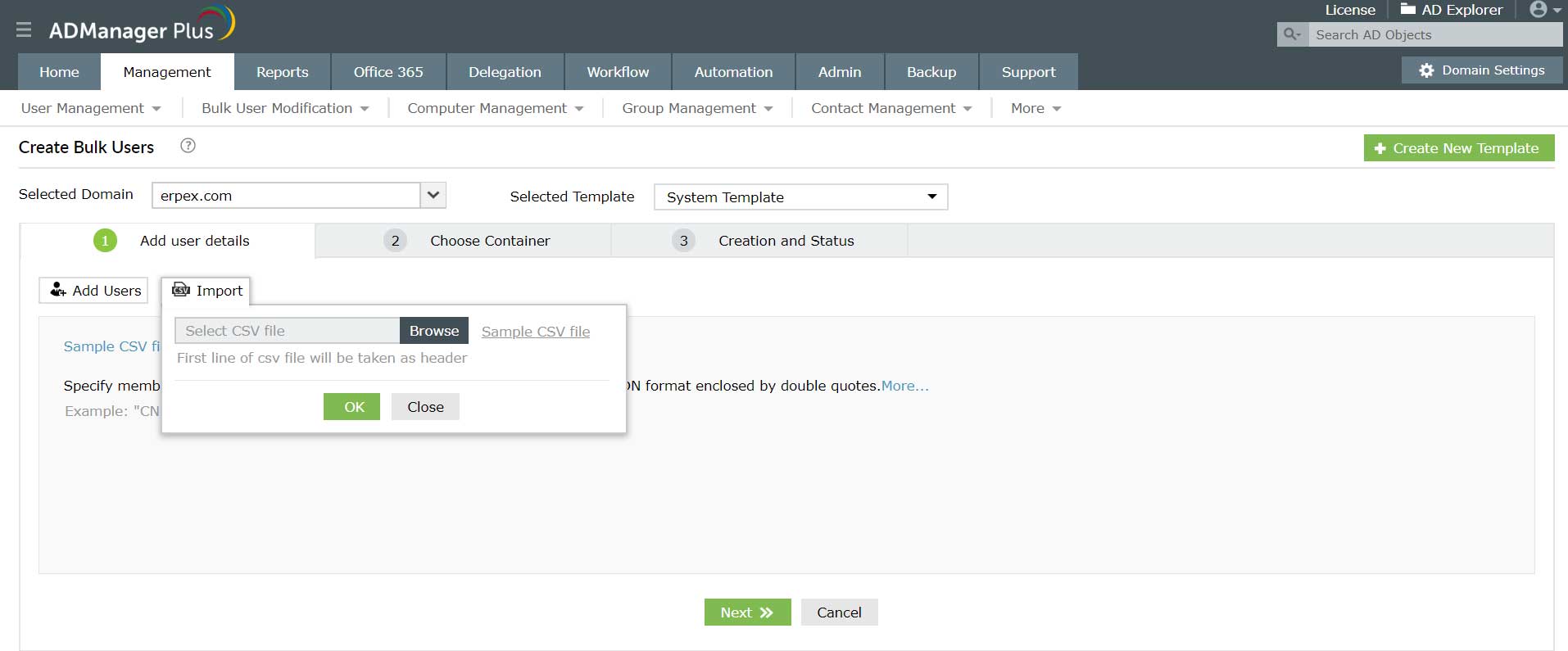 Иногда организации одновременно набирают большое количество сотрудников, стажеров или студентов. Добавление каждого из них по отдельности в Active Directory утомительно, обременительно и этот процесс подвержен ошибкам, а использование PowerShell для массовой подготовки учетных записей AD слишком сложно для практического применения. С помощью ADManager Plus можно импортировать значения атрибутов нескольких пользователей из CSV-файла и создать для них учетные записи пользователей AD всего несколькими щелчками мыши.