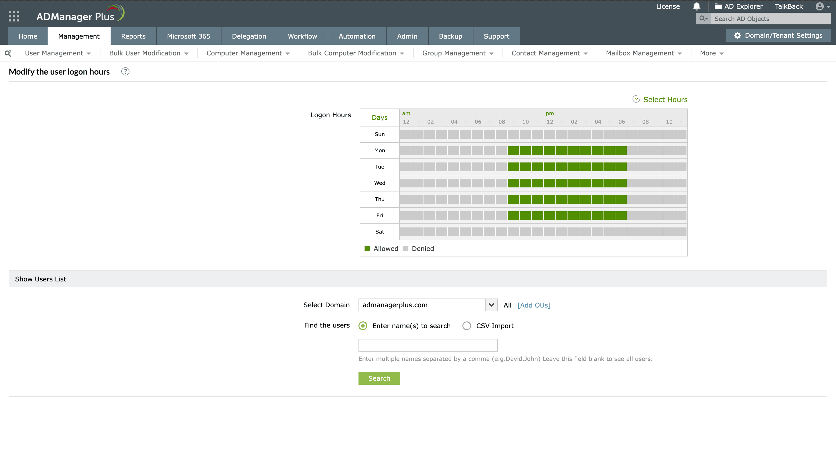 Изменяйте время входа в систему для нескольких пользователей Active Directory одновременно с помощью интуитивно понятного интерфейса ADManager Plus.