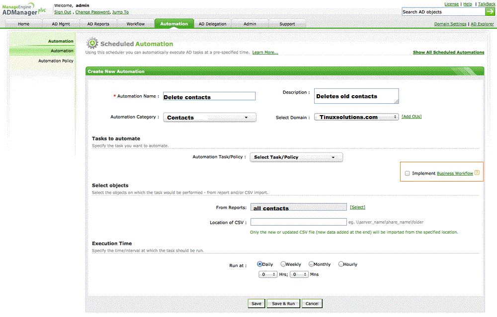 Полная автоматизация ответственных задач AD, таких как подготовка пользователей, удаление неактивных пользователей и т. д. Также позволяет задавать последовательность задач и выполнять контрольные задачи и объединять их с рабочим процессом для обеспечения превосходно контролируемой автоматизации.