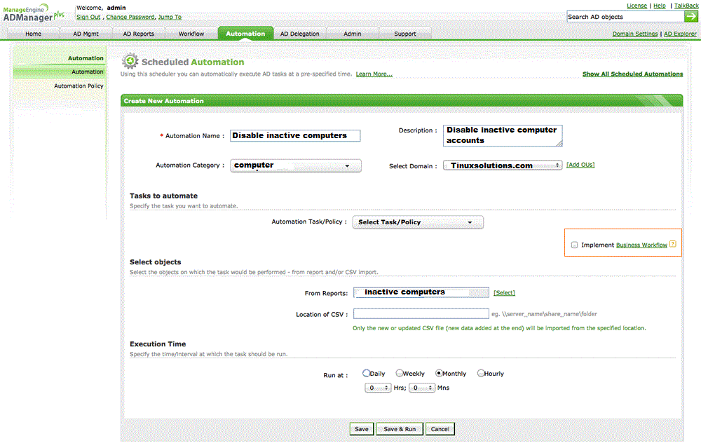 Полная автоматизация ответственных задач AD, таких как подготовка пользователей, удаление неактивных пользователей и т. д. Также позволяет задавать последовательность задач и выполнять контрольные задачи и объединять их с рабочим процессом для обеспечения превосходно контролируемой автоматизации.