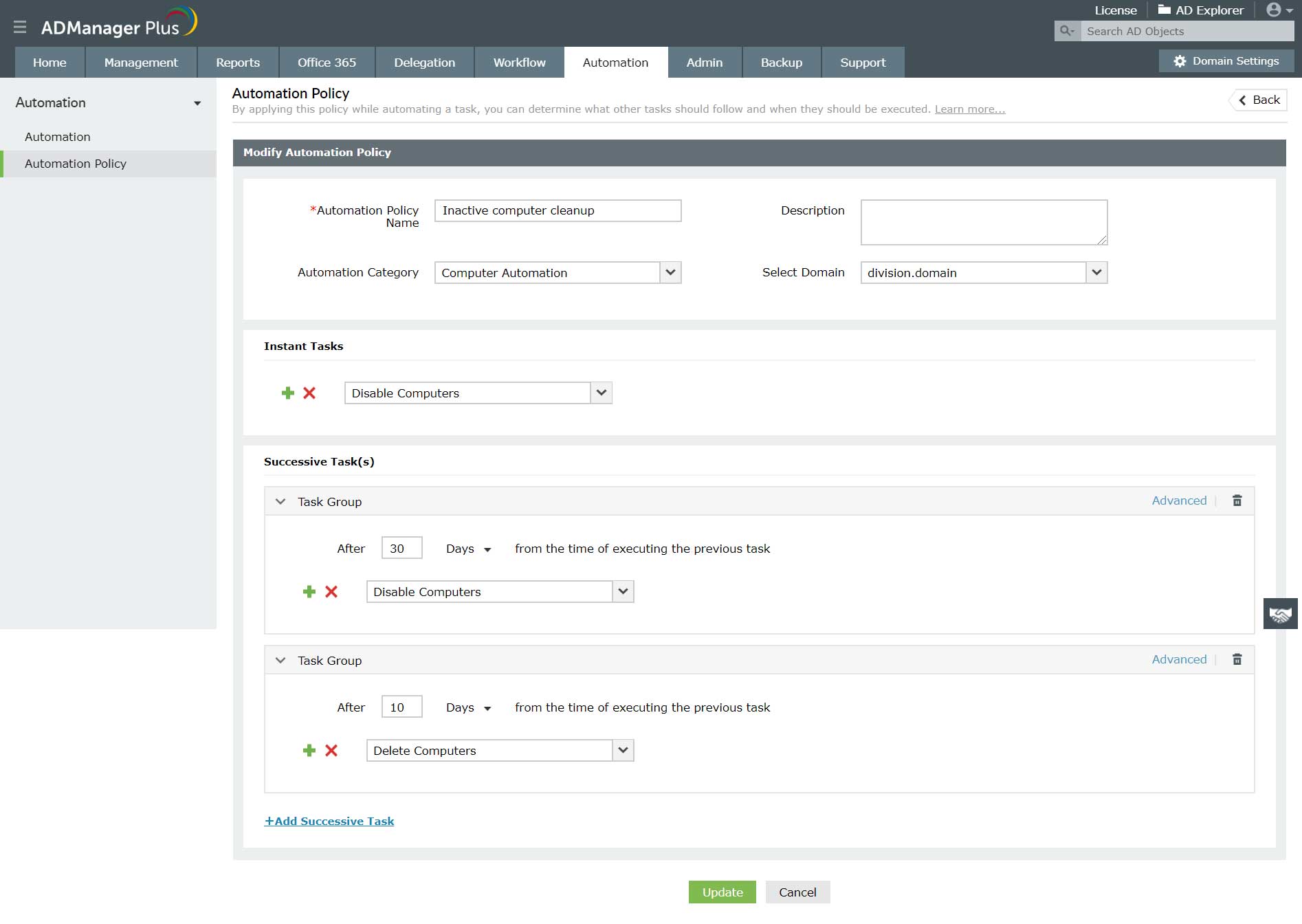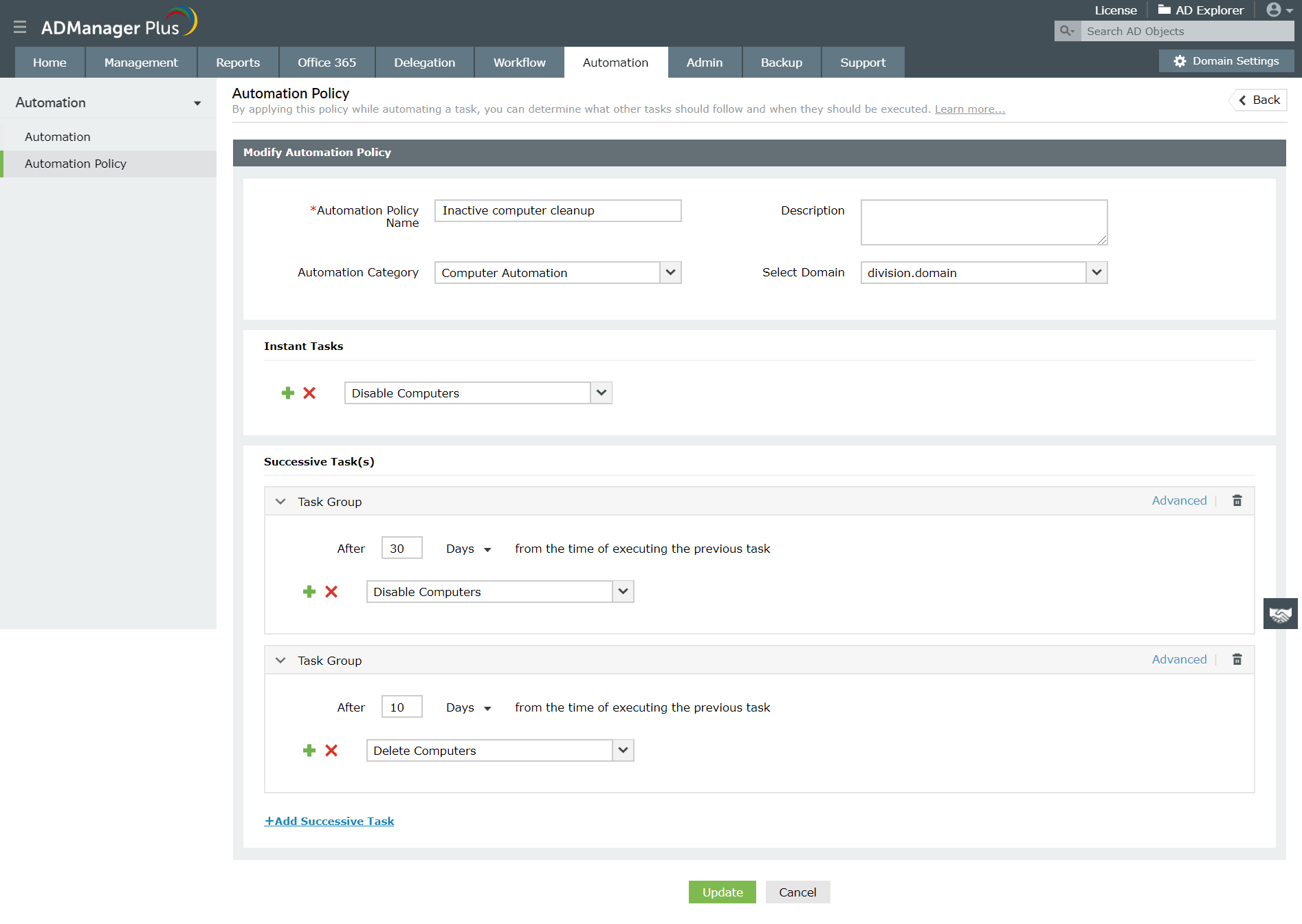 Функция политики автоматизации в ADManager Plus также позволяет настраивать последующие или дополнительные задачи для всех действий, связанных с учетной записью пользователя. Например: предположим, вы хотите, чтобы автоматизация запускалась 30-го числа каждого месяца и отключала неактивных пользователей, а по истечении двух месяцев необходимо удалить этих отключенных пользователей. Этого можно добиться, настроив политику автоматизации с последовательностью задач в желаемом порядке выполнения и реализовав эту политику в средстве автоматизации.