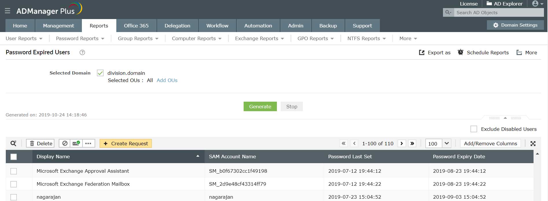 ADManager Plus - это веб-решение для управления и отчетности AD, Microsoft 365 и Exchange, которое предлагает более 200 предварительно заданных отчетов, включая отчеты о паролях, для определения следующего: