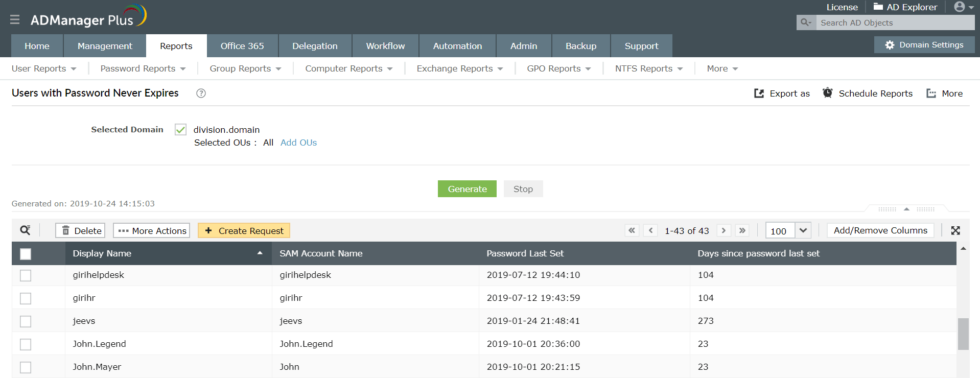 Несмотря на то что для получения этой информации из AD можно использовать собственные инструменты Microsoft, такие как оснастка "Пользователи и компьютеры Active Directory" (ADUC) и PowerShell, этот процесс чрезвычайно ресурсоемкий и требует глубоких знаний в области написания сценариев. ADManager Plus, инструмент для управления паролями AD и создания отчетов, помогает получать подробную информацию о паролях AD без единой строки сценария PowerShell.