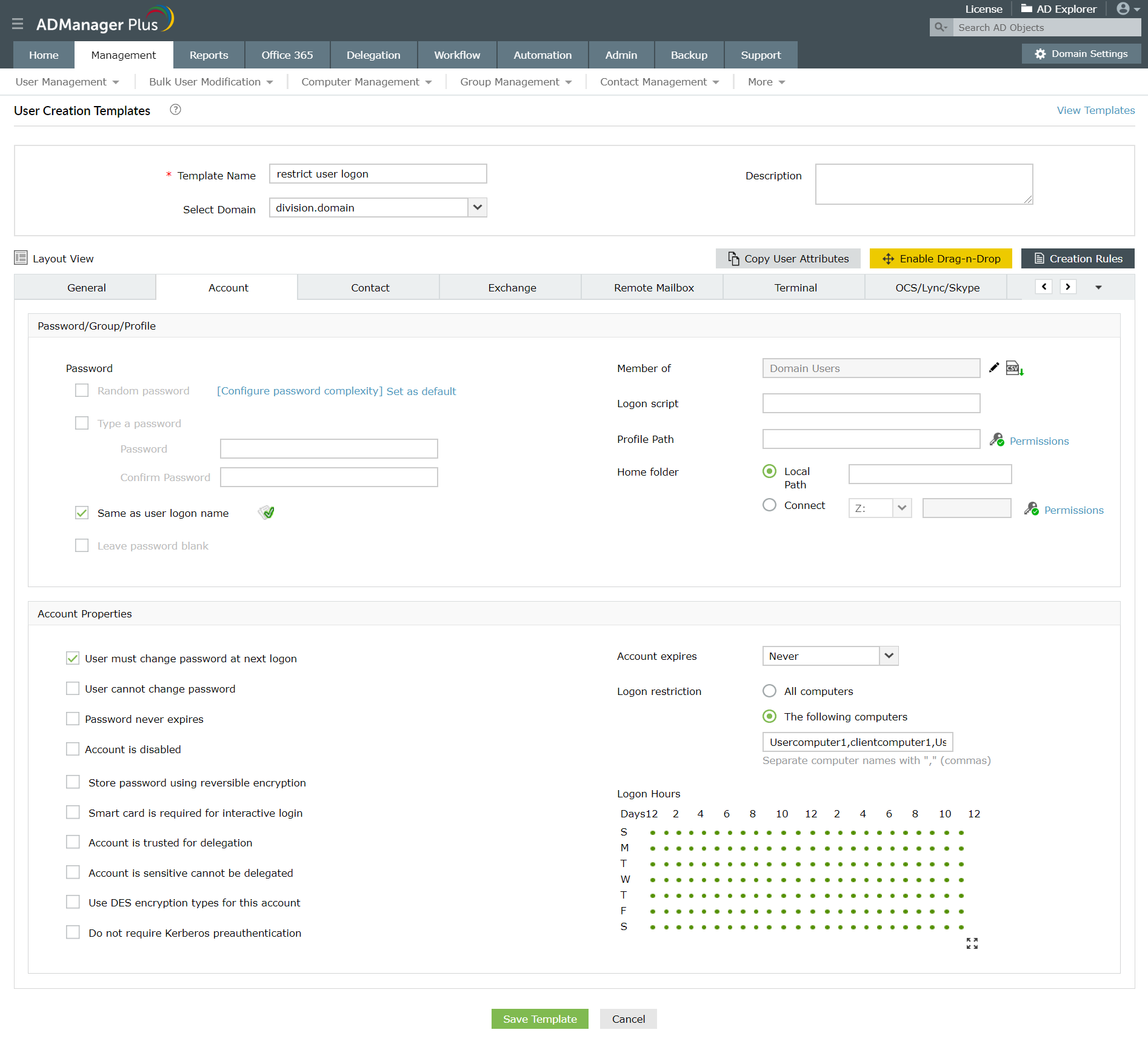 ADManager Plus позволяет указывать компьютеры, с которых пользователи могут входить в Active Directory, во время процесса создания пользователя. Используя всеобъемлющие шаблоны создания пользователей в этом инструменте, можно создавать учетные записи пользователей, а также настраивать ограничения на вход в систему и все необходимые атрибуты для них всего за один шаг. Вы также можете установить ограничение на вход в систему для существующих учетных записей пользователей на определенном компьютере, используя функции группового изменения учетных записей пользователей данного программного продукта.