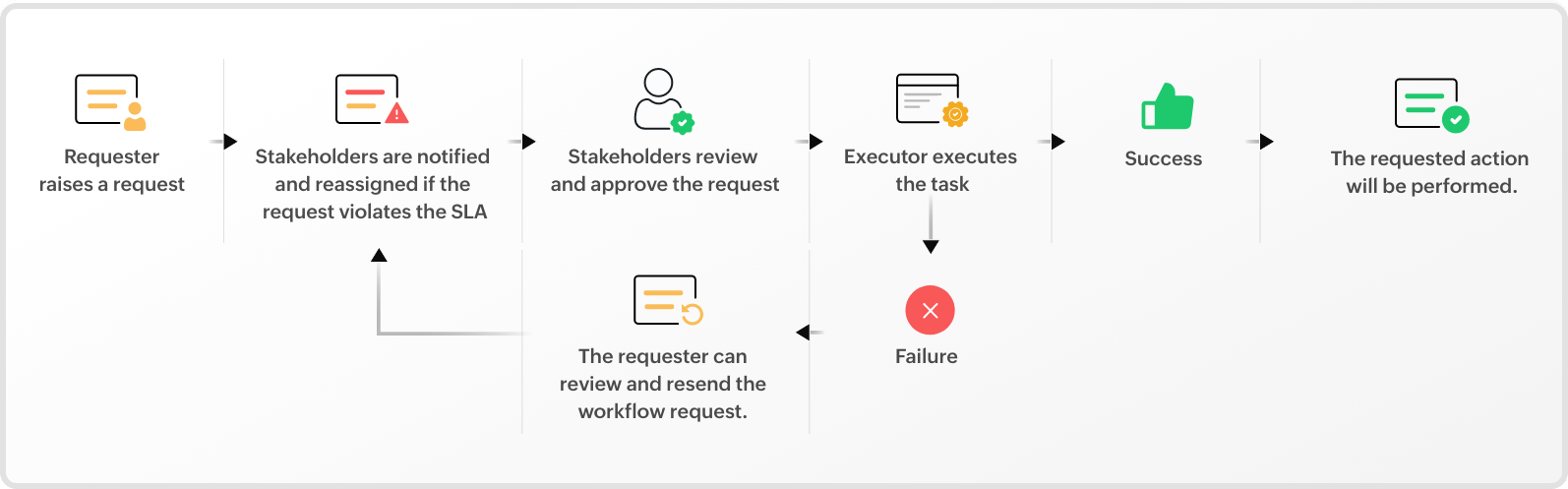 Рабочий процесс в ADManager Plus представляет собой многоуровневый процесс утверждения, который позволяет администраторам контролировать делегированные задачи и оптимизировать их выполнение. Рабочий процесс может иметь максимум четыре различных уровня с различными агентами рабочего процесса, а именно: авторами заявок, рецензентами, утверждающими и исполнителями, каждый из которых играет важную роль в выполнении задачи. Администраторы могут настраивать процесс утверждения, то есть определять количество уровней проверки в зависимости от выполняемой задачи. Например, истка ADоч не должна выполняться без надзора, поэтому соответствующий рабочий процесс должен иметь проверяющего и исполнителя.