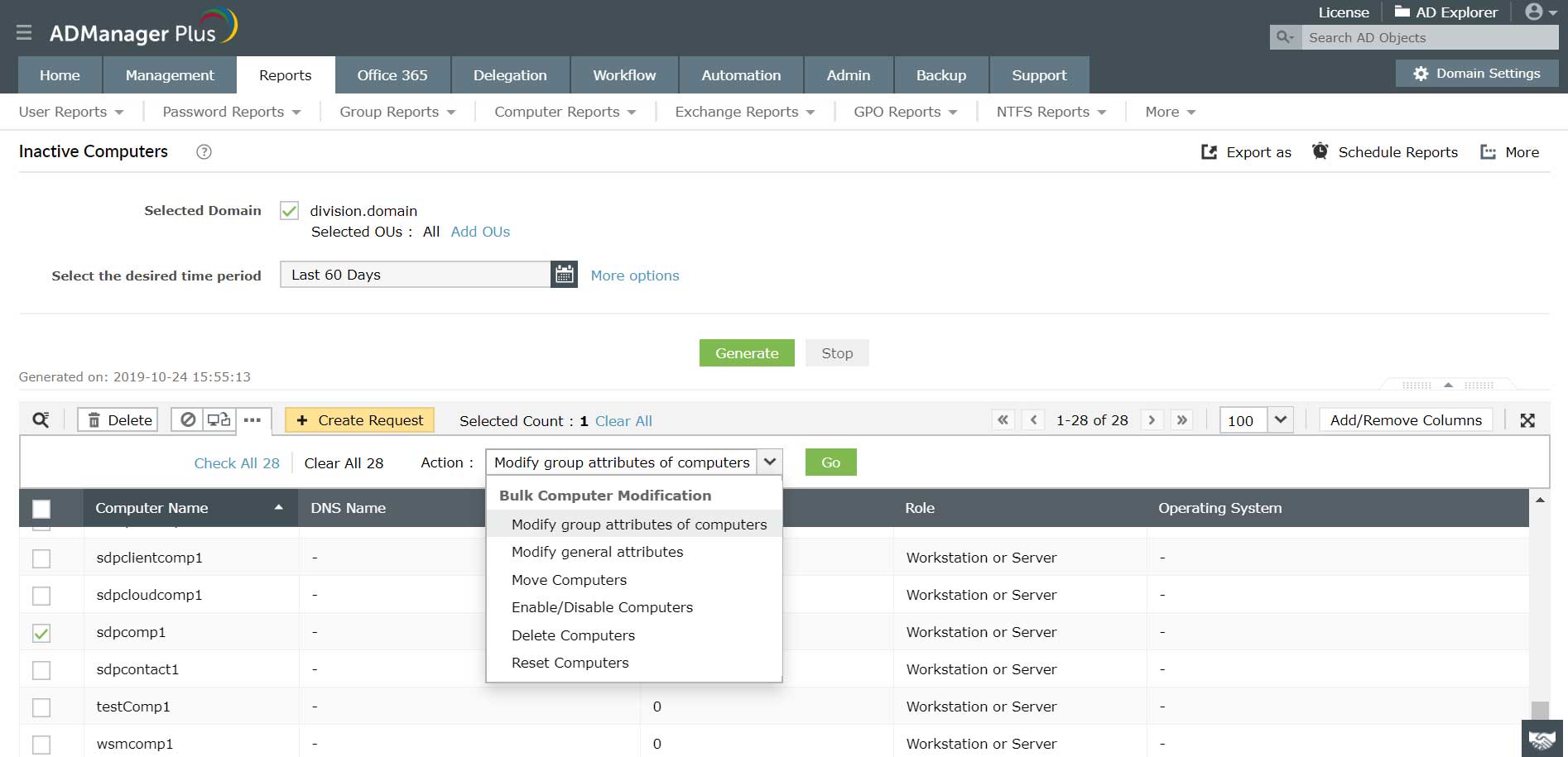 Отчеты о компьютерах Active Directory предоставляют администраторам полный обзор объектов компьютеров в доменах. Благодаря этим отчетам, создание которых также можно запланировать, вы можете избавиться от необходимости вручную создавать сценарии для извлечения всей необходимой информации о компьютере вручную. Также можно применять встроенные фильтры, чтобы уточнить условия поиска и получить только необходимые данные. Например, можно отфильтровать результаты, чтобы отобразить атрибуты "memberOf" компьютеров.