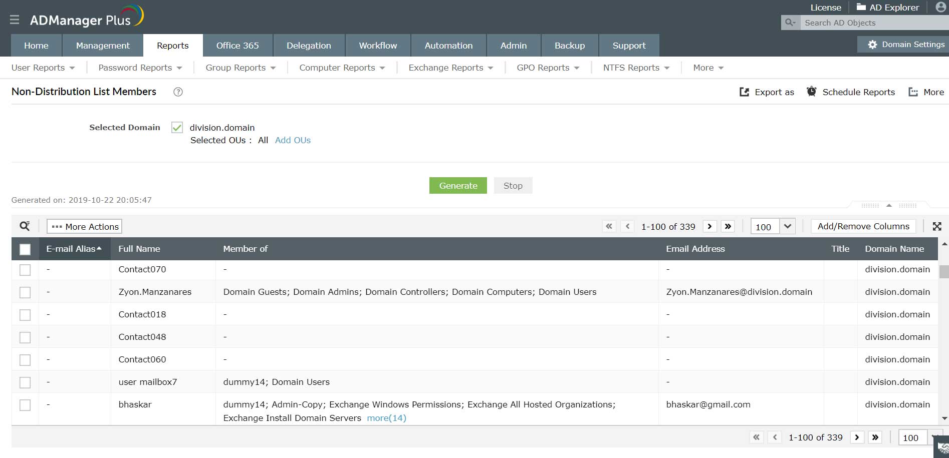 Отчеты о Microsoft Exchange, предлагаемые этим инструментом, которые можно регулярно создавать и экспортировать автоматически или по запросу, сгруппированы по нескольким категориям, таким как отчеты о списках рассылки, отчеты о функциях Exchange и т. д., чтобы быстро получить представление об атрибутах Exchange пользователей, которые входят и не входят в списки рассылки. Это помогает администраторам проверять участников и обновлять их в списках рассылки; просматривать адреса прокси-серверов, адреса электронной почты, хранилище почтовых ящиков, настройки получателей, POP3 и т. д. Еще одним огромным преимуществом является тот факт, что все эти отчеты можно создавать для нескольких версий, а именно Exchange 2003, 2007, 2010, 2013 и 2016.