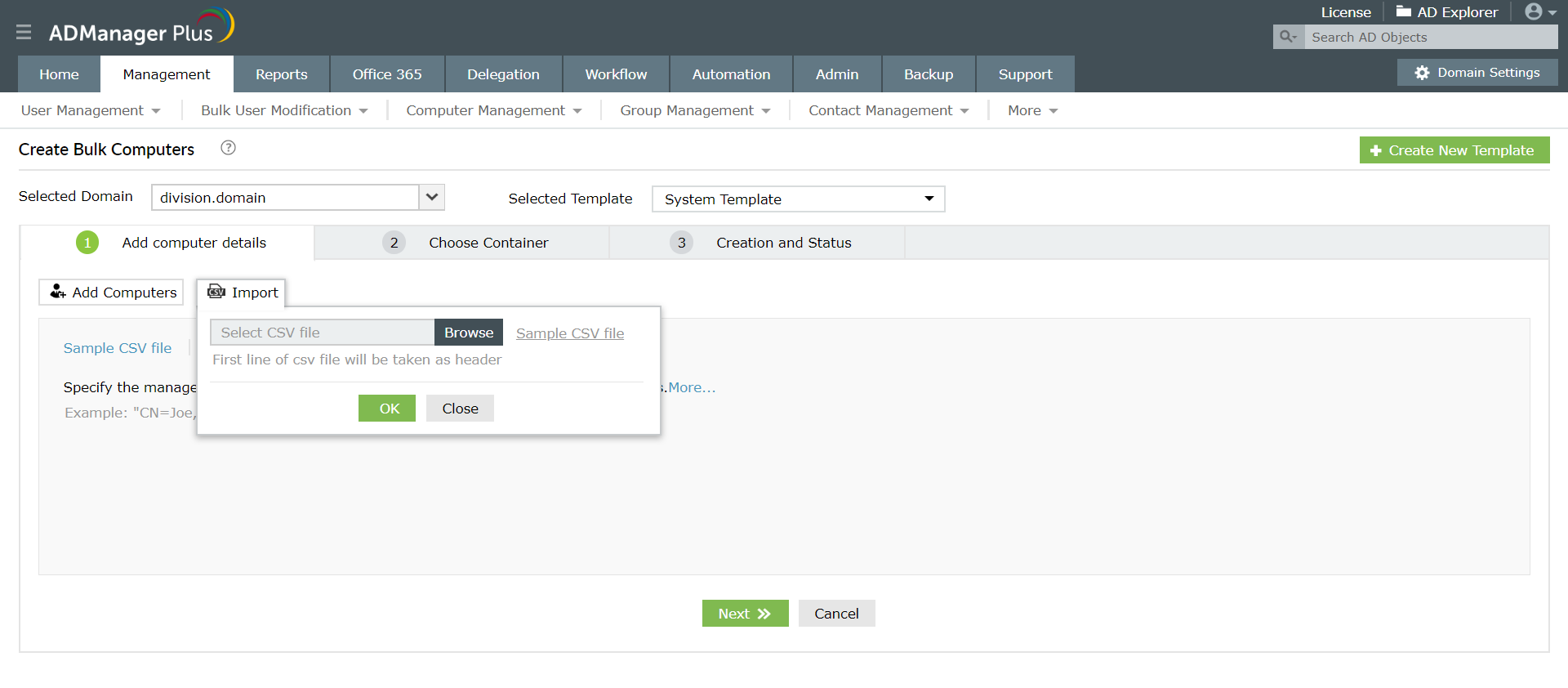 Импортировав CSV-файл, содержащий необходимые атрибуты компьютера, можно одновременно создать несколько учетных записей компьютеров в AD. После импорта CSV-файла в ADManager Plus администраторы могут использовать шаблоны для стандартизации значений атрибутов в соответствии с политиками своей организации. Наконец, инструмент проверяет информацию о компьютере, и соответствующие изменения вносятся в Active Directory.