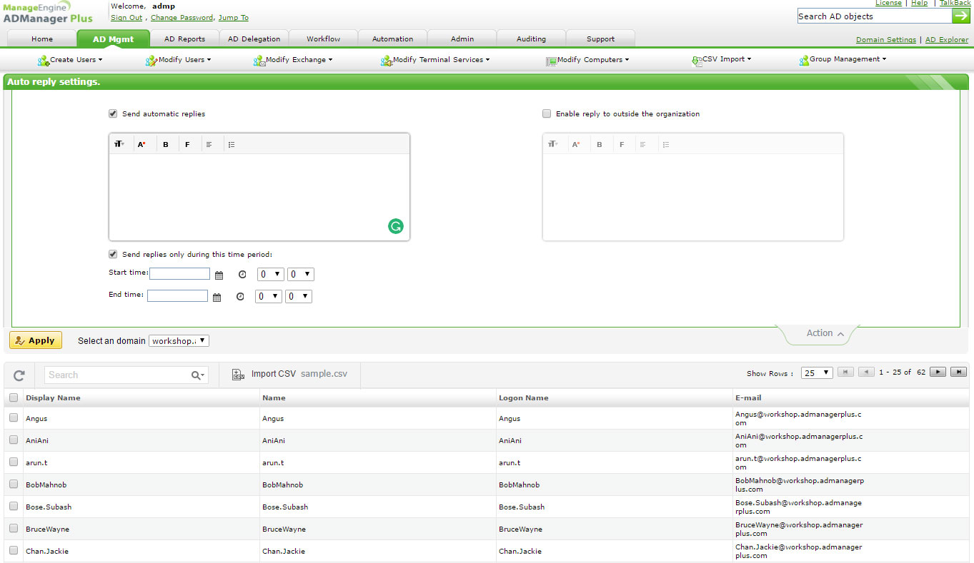 ADManager Plus - интегрированное веб-решение для управления Active Directory, Exchange Server, Office 365 и другими службами - предлагает возможность настраивать автоматические ответы на электронные письма, отправляемые как по отдельности, так и в пакетном режиме на почтовые ящики Exchange пользователей. Оно позволяет настраивать эти параметры исключительно с помощью действий на основе графического интерфейса, в отличие от инструментов Exchange, которые не предлагают для этого никаких других вариантов, кроме PowerShell.