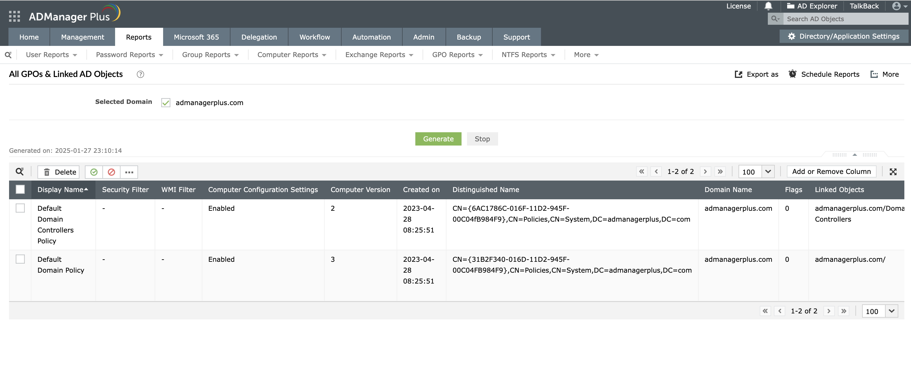 Напротив, чтобы экспортировать параметры групповой политики с помощью ADManager Plus, можно просто сгенерировать предварительно определенный отчет, выбрав функцию "Все объекты групповой политики и связанные объекты AD", и выбрать любой из доступных форматов для экспорта отчета в простом, интуитивно понятном пользовательском интерфейсе.