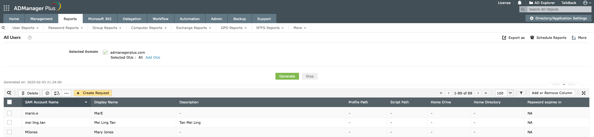 ADManager Plus помогает получить ту же информацию с помощью веб-консоли с графическим интерфейсом посредством предварительно настроенных отчетов, в которых перечислены все учетные записи пользователей. Кроме того, вы также можете выполнять действия по управлению, такие как изменение, удаление и т. д., прямо из отчетов. Также вам предоставляется возможность запланировать отчеты и автоматически отправлять их по электронной почте заинтересованным лицам. Подробнее об этом можно узнать здесь.