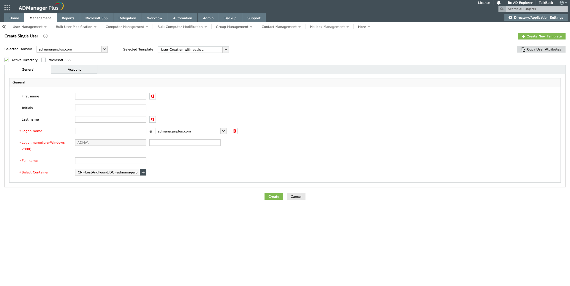 - При использовании PowerShell автоматизация создания новых пользователей требует сложного и длинного сценария. Тогда как ADManager Plus позволяет автоматизировать создание пользователей с помощью простых действий мышью.