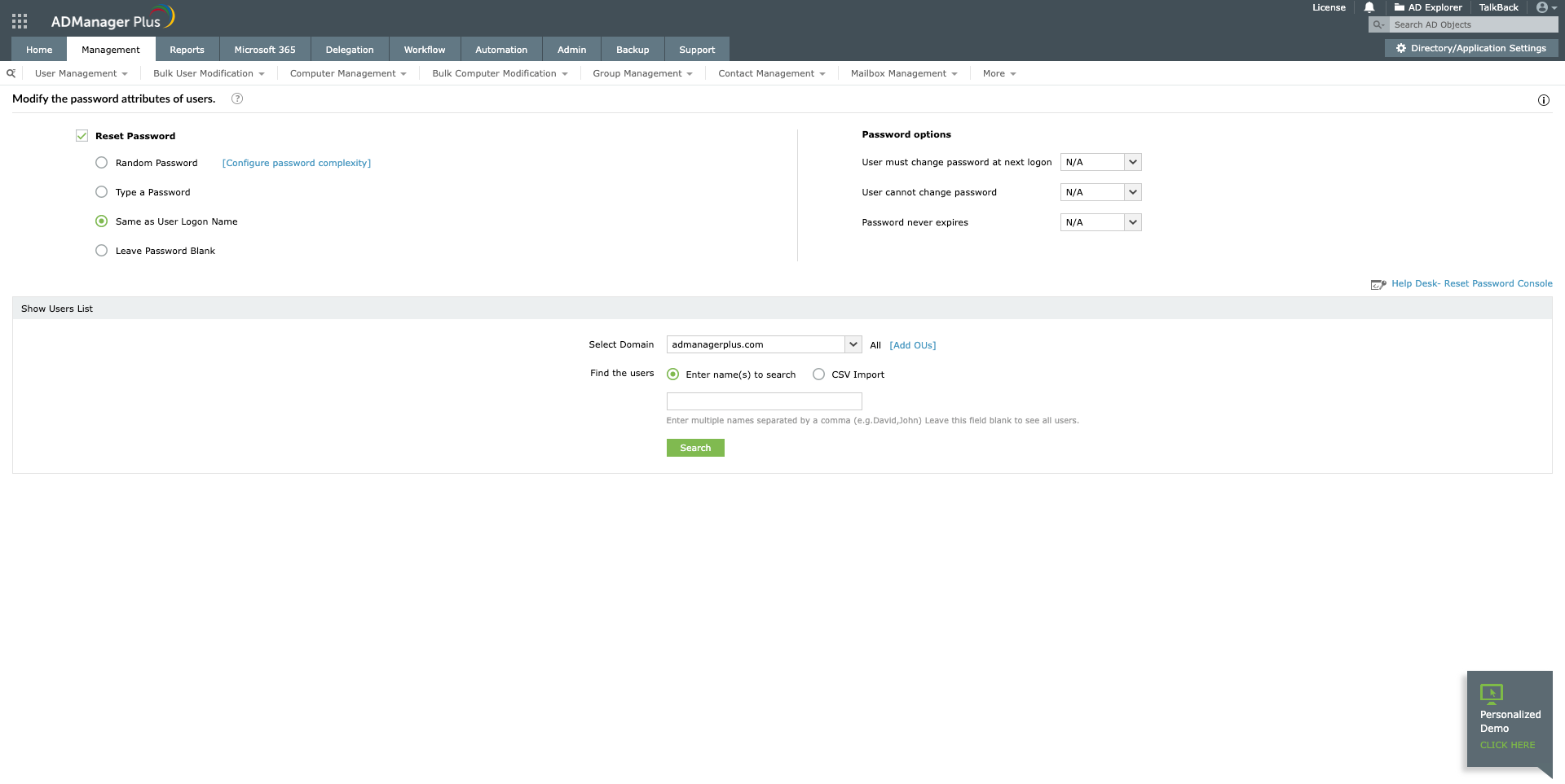 ADManager Plus позволяет сделать то же самое всего несколькими щелчками мышью через веб-консоль с графическим интерфейсом. Также имеются возможности для изменения настроек паролей нескольких пользователей одновременно с помощью шаблонов или путем импорта CSV-файла содержащего измененные значения атрибутов.