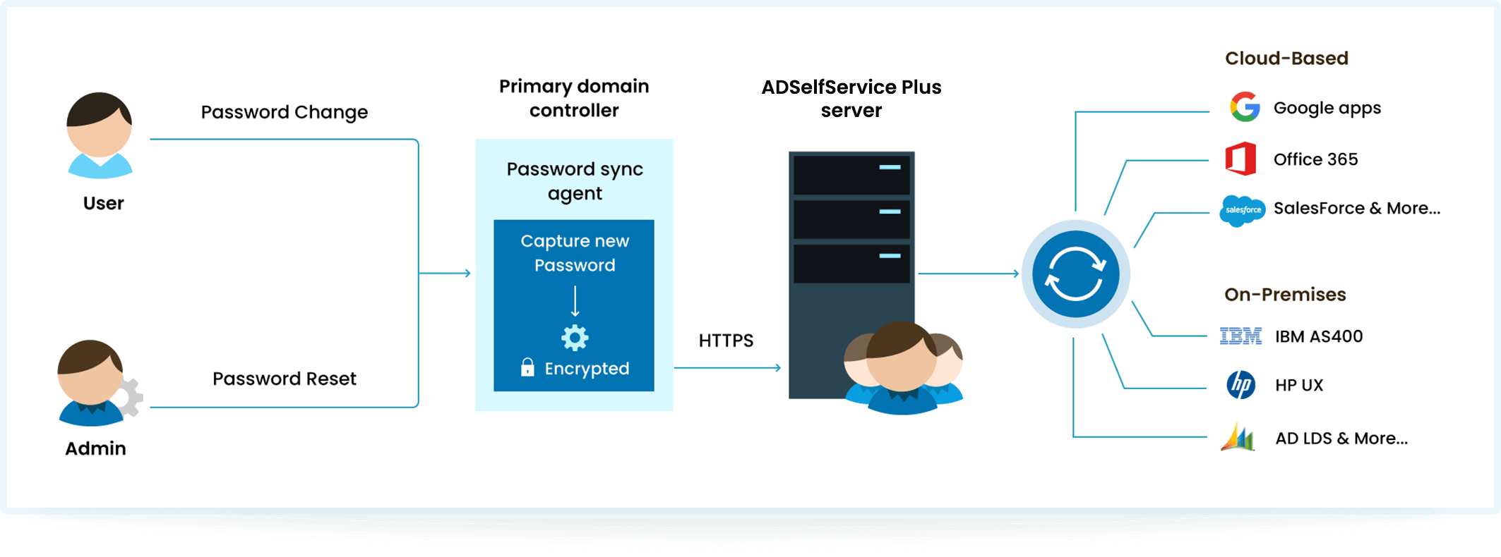 Пароли можно синхронизировать в AD с помощью инструментов синхронизации, таких как ADSelfService Plus, которые обновляют пароли во всех подключенных системах всякий раз, когда пользователь меняет свой пароль AD.