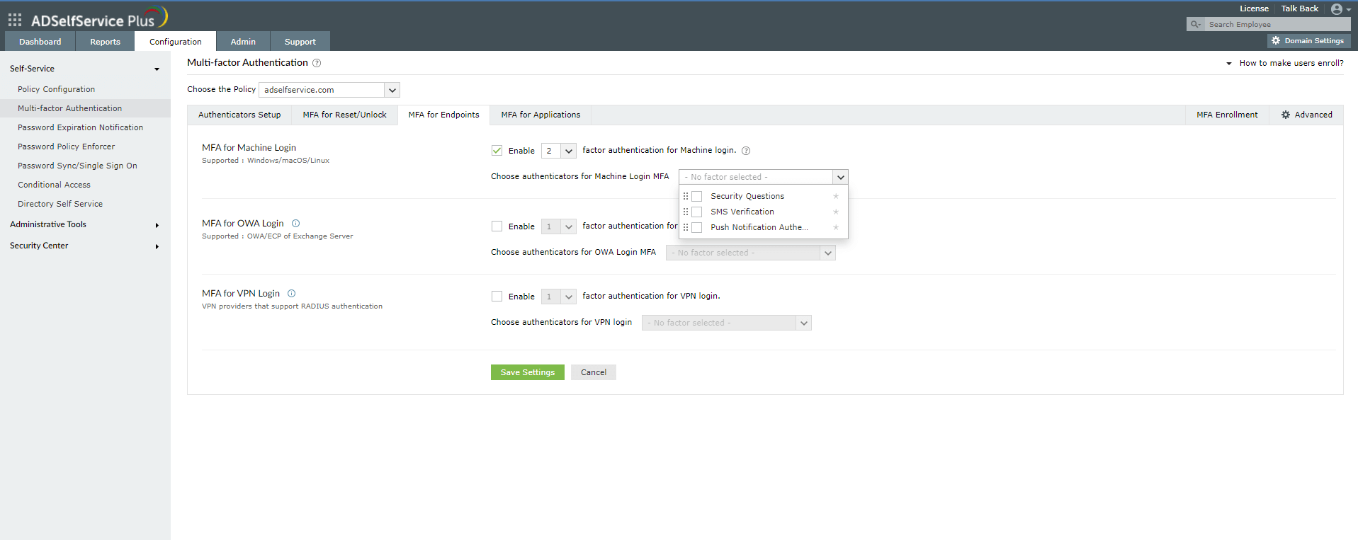 Рис. 1. Настройка аутентификаторов для MFA для RDP в ADSelfService Plus.