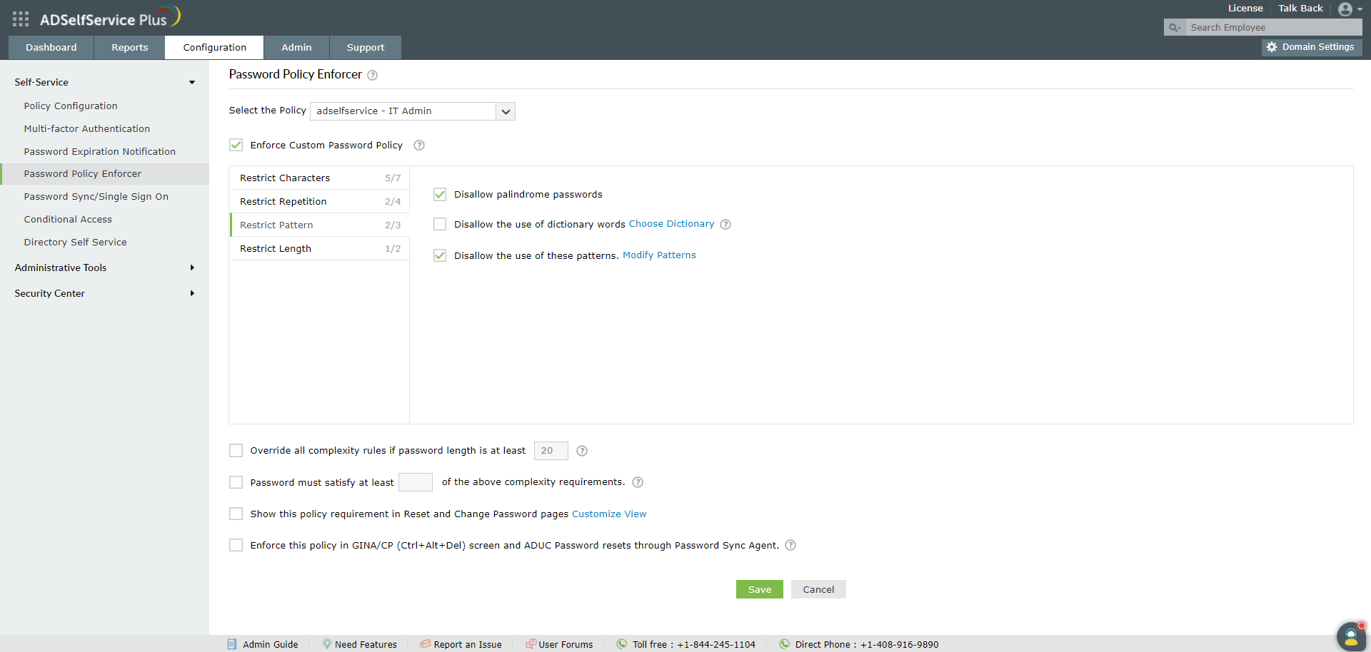Расширенные возможности настройки политики паролей ADSelfService Plus запрещают пароли из словаря и ненадежные пароли, палиндромы, комбинации клавиш и многое другое.