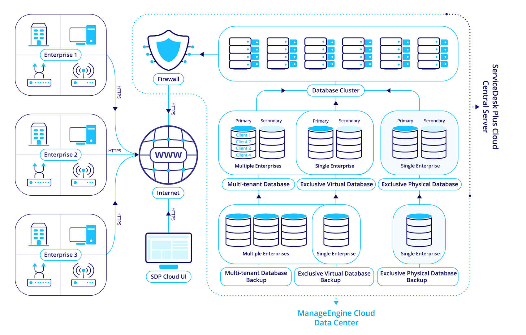 Решение ServiceDesk Plus Cloud размещено в собственных центрах обработки данных ManageEngine по всему миру. Пространства для хранения данных для каждого предприятия логическим образом разделены на разделы в многопользовательской базе данных, которая размещена в кластере физических серверов, за счет чего обеспечивается конфиденциальность данных каждого клиента. Такая общедоступная облачная многопользовательская платформа обеспечивает ряд преимуществ: Предприятия могут отказаться от ряда требований к ресурсам, таких как наличие штата сотрудников, затраты средств и времени, связанные с настройкой инфраструктуры серверов для локального программного обеспечения, а также могут быстро и с легкостью переносить и настраивать приложения благодаря автоматической регистрации доменов и поддоменов.