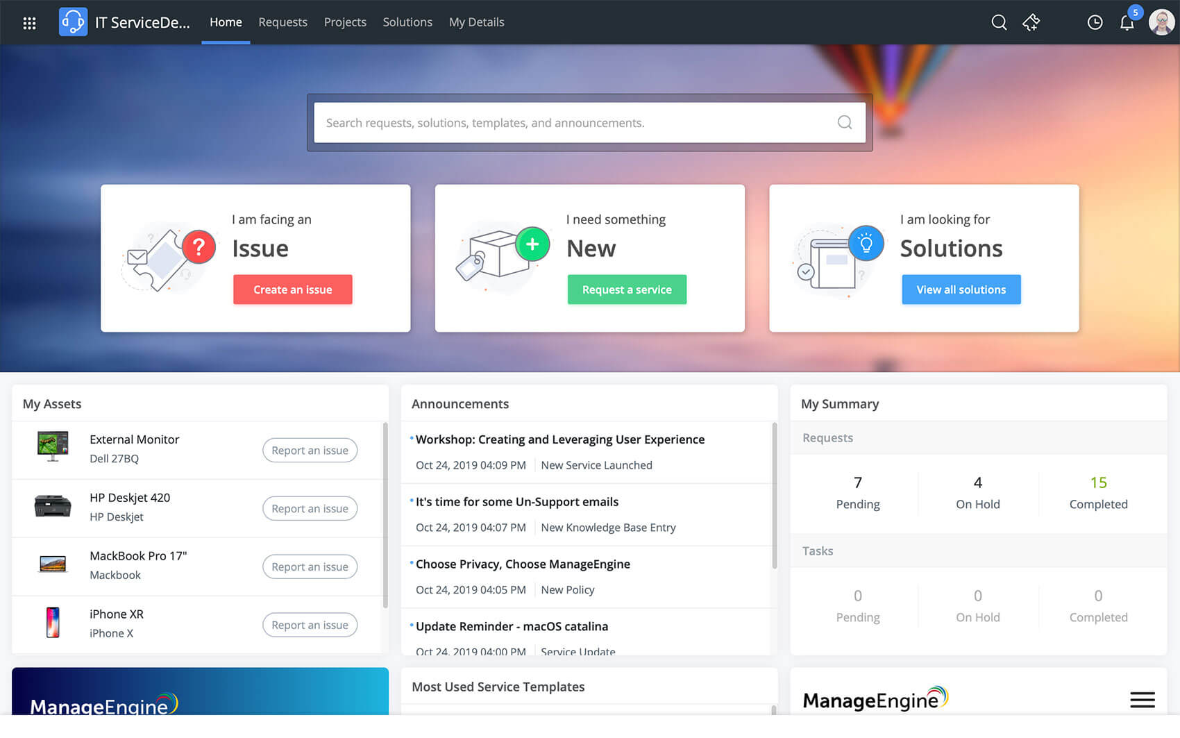 - Повысьте удобство пользователей с помощью настраиваемого портала самообслуживания, включающего в себя встроенную базу знаний, доску объявлений, доступ к виджетам и модулям на основе ролей, а также поддержку в живом чате.
