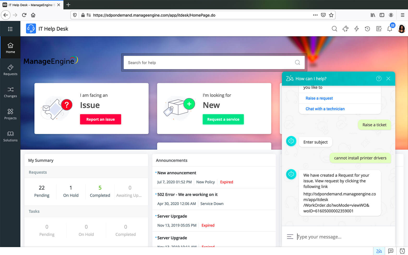 - Предоставьте пользователям необходимые возможности, обеспечив доступность услуг из любой точки мира с помощью портала самообслуживания. Информируйте авторов заявок о ходе обработки их заявок с помощью автоматических уведомлений и предоставьте им возможность связаться с техническими специалистами на портале.