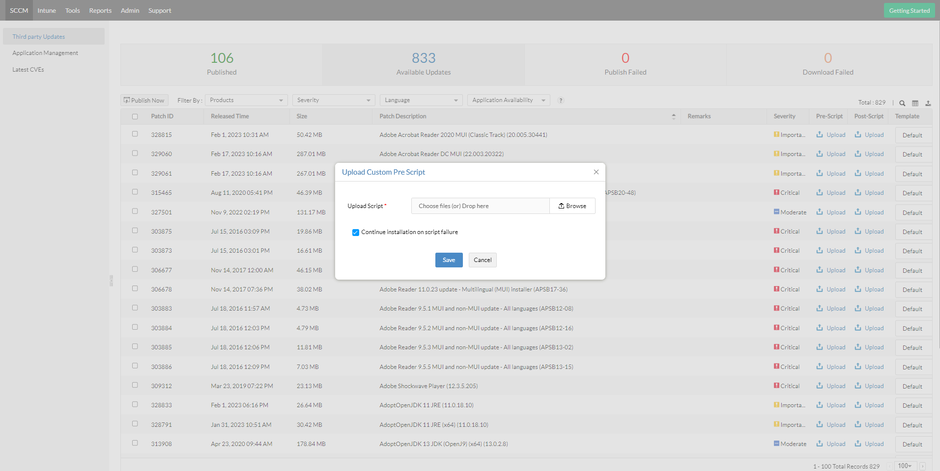 Step 5: Once you find the required update from the list of available updates, you can then find the designated options to upload pre-script and post-script.