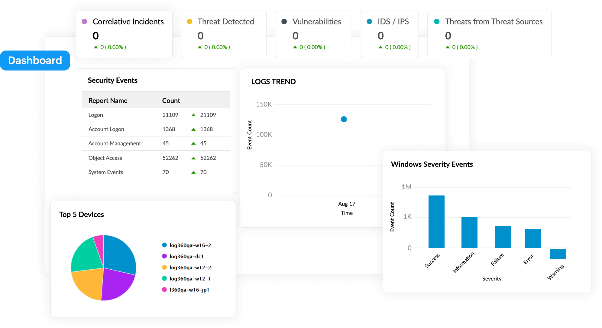 Log360 är en omfattande lösning för säkerhetsinformation och händelsehantering (SIEM som är utformad för att möta SOC:s utmaningar. Den hjälper SOC att upptäcka hot, identifiera avvikande användarbeteenden, spåra misstänkt nätverksaktivitet medrealtidsvarningar, systematiskt hantera säkerhetsincidenter med arbetsflödeshantering, följa upp incidenthanteringsprocesser med sitt inbyggda ärendehanteringssystem, genomföra regelbundna säkerhetsgranskningar, skydda känsliga data med hjälp av filintegritetsövervakning och mycket mer. Log360 hjälper också till att uppfylla regelverkskrav för PCl DSS, HIPAA, FISMA, SOX, GDPR, GLBA och mer med sitt integrerade system för efterlevnadshantering.