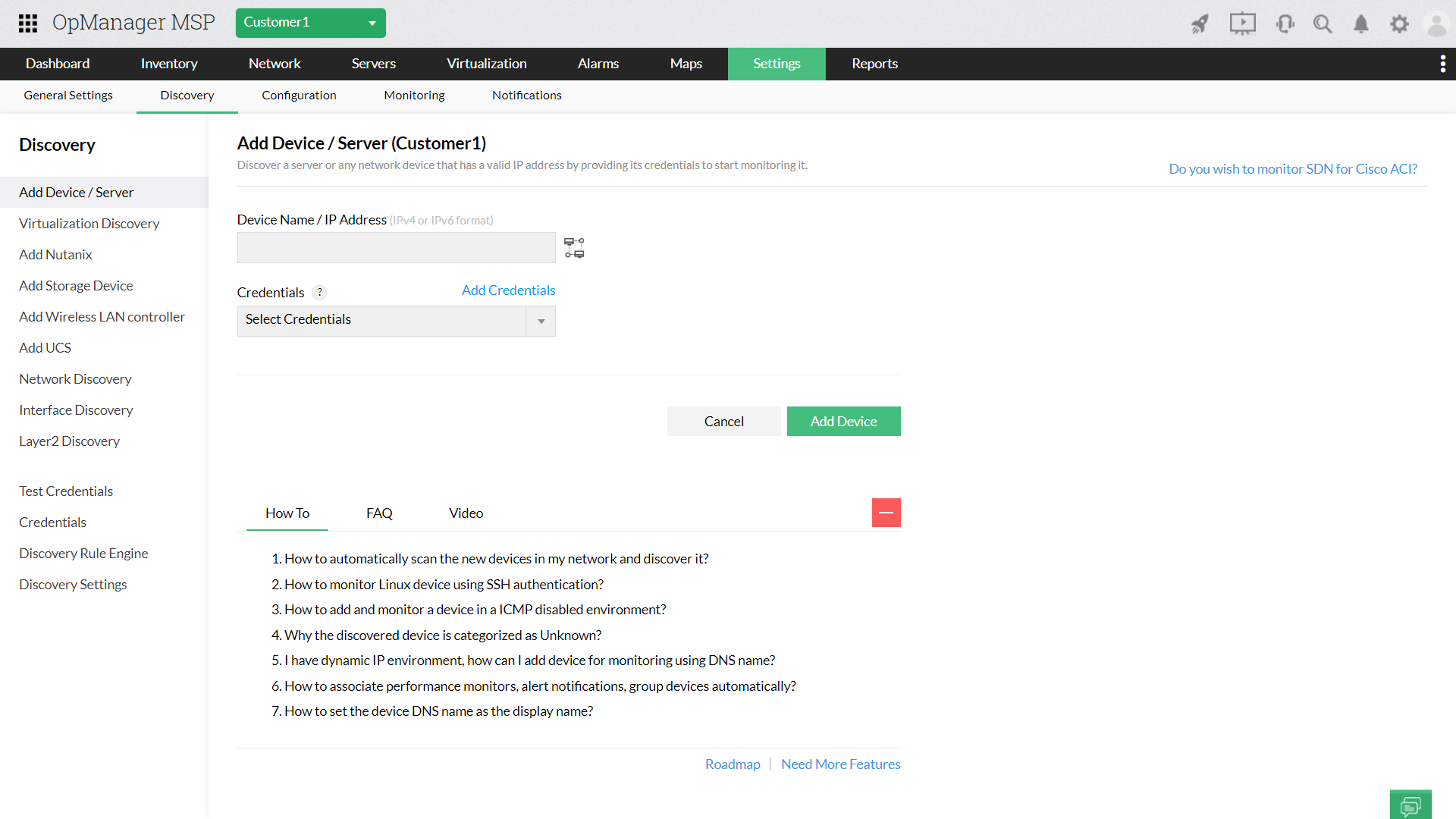 När du har konfigurerat sond- och kundinformationen i den centrala servern kan du omedelbart börja upptäcka enheter från klientnätverk. Med OpManager MSP:s arkitektur med flera klienter kan du upptäcka enheter bekvämt från den centrala konsolen. Med OpManager MSP kan du antingen upptäcka enheter manuellt eller välja automatiserade upptäcktsalternativ med vilka du kan upptäcka enheter i bulk.
