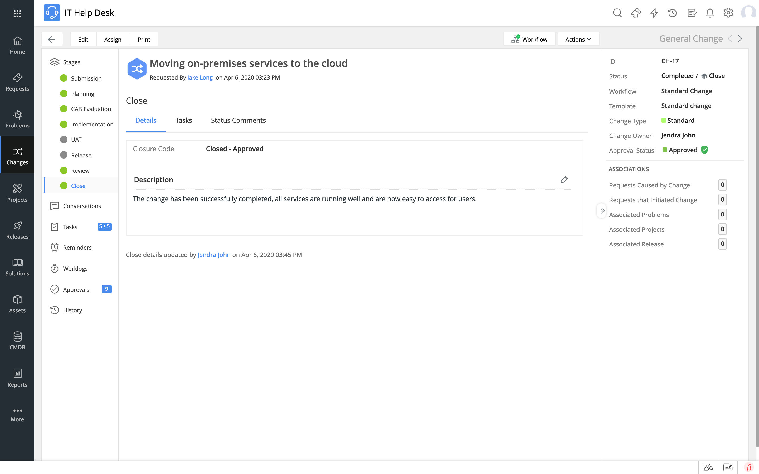 Detta är det sista steget i ändringshanteringsprocessen. Status för slutförda ändringen registreras som framgångsrik, misslyckad eller ofullständig. Om rätt stängningskod registreras gör det en organisations mätvärden mycket mer exakta och användbara