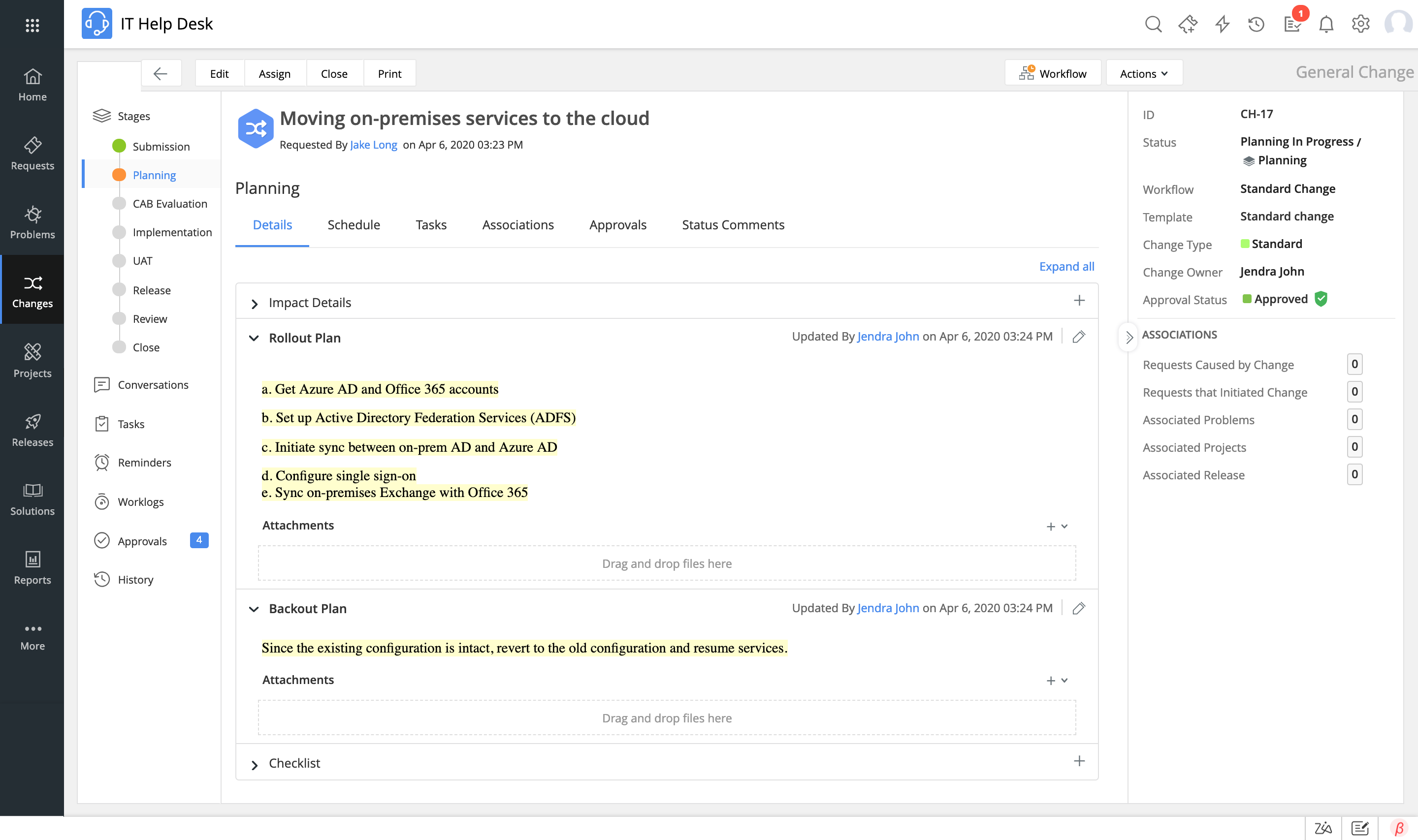 Därefter måste ändringsplanen godkännas av det rådgivande utskottet för ändringar (CAB), rådgivningsnämnden för nödfallsändringar (ECAB) och alla andra auktoriteter som har ett intresse i ändringen eller i organisationsinfrastrukturen som påverkas av ändringen. Anpassade CAB:er hjälper organisationer att gruppera relevant personal att enkelt hantera godkännanden. Automatisering av godkännandeprocessen påskyndar ändringen och säkerställer att inga godkännandeförfrågningar förbises.