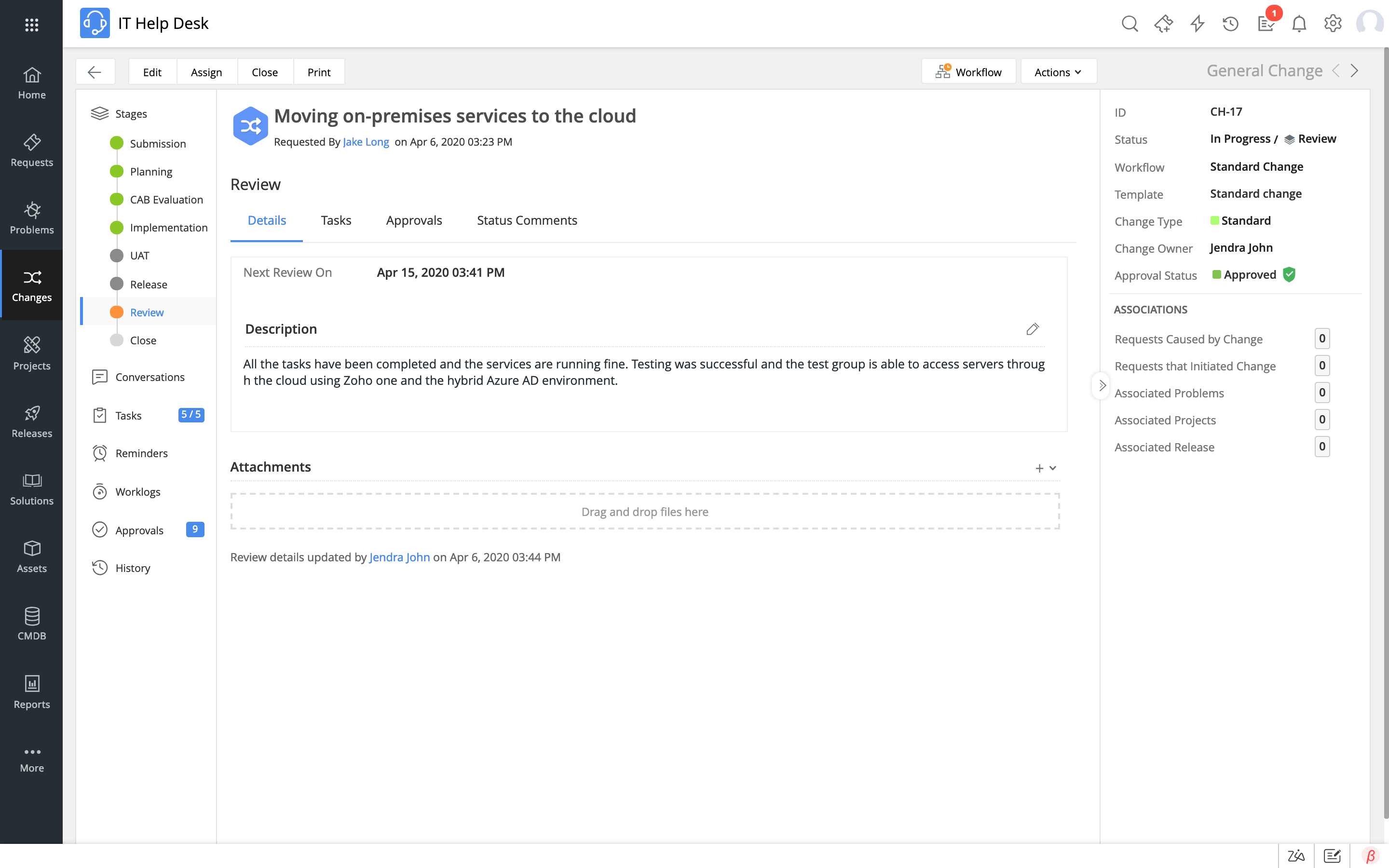 Ändringshantering ger dig bättre kontroll över din förändringsprocess och hjälper dig att genomföra ändringar med minimal risk. Genom att följa standardprocesser säkerställer ändringshantering att alla aspekter av varje förändring, som till exempel planering, riskbedömning och spårning av implementeringen, hanteras effektivt. Ett servicedesk-verktyg för att spåra ändringar från början till slut kan göra underverk och göra det möjligt för en organisation att bättre hantera sin IT-infrastruktur med väl planerade och genomförda ändringar.