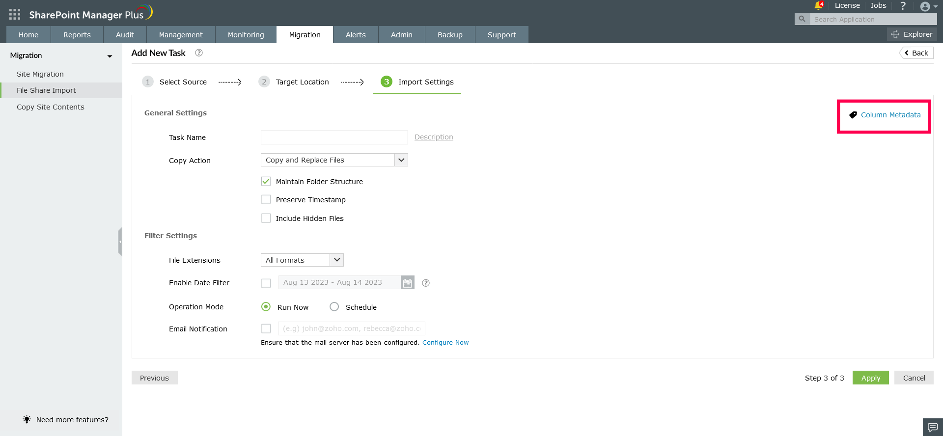 - To import files, navigate to Migration → File Share Import. Click on Add New Task button to add new task.