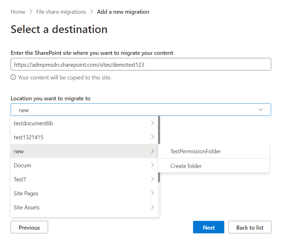 - step 4 Select the destination site and the document library or its folder to which you'd like to migrate. Click Next.