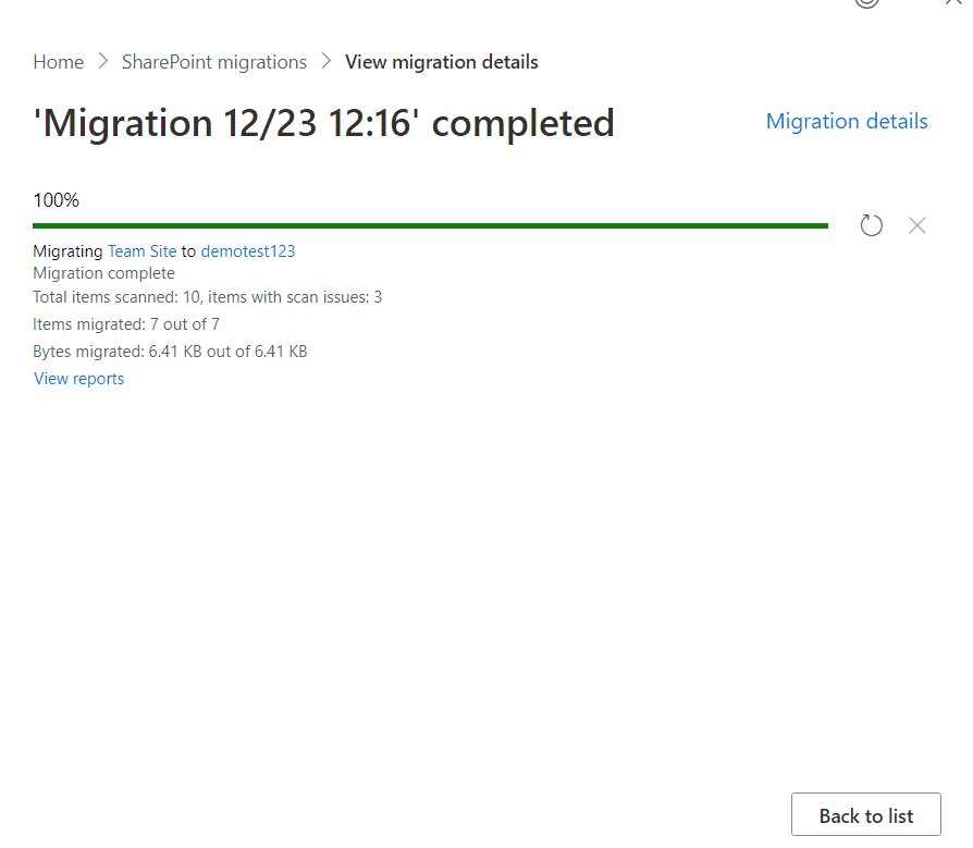 - step 6 Once the migration is completed, click View reports to get detailed information on the migration.