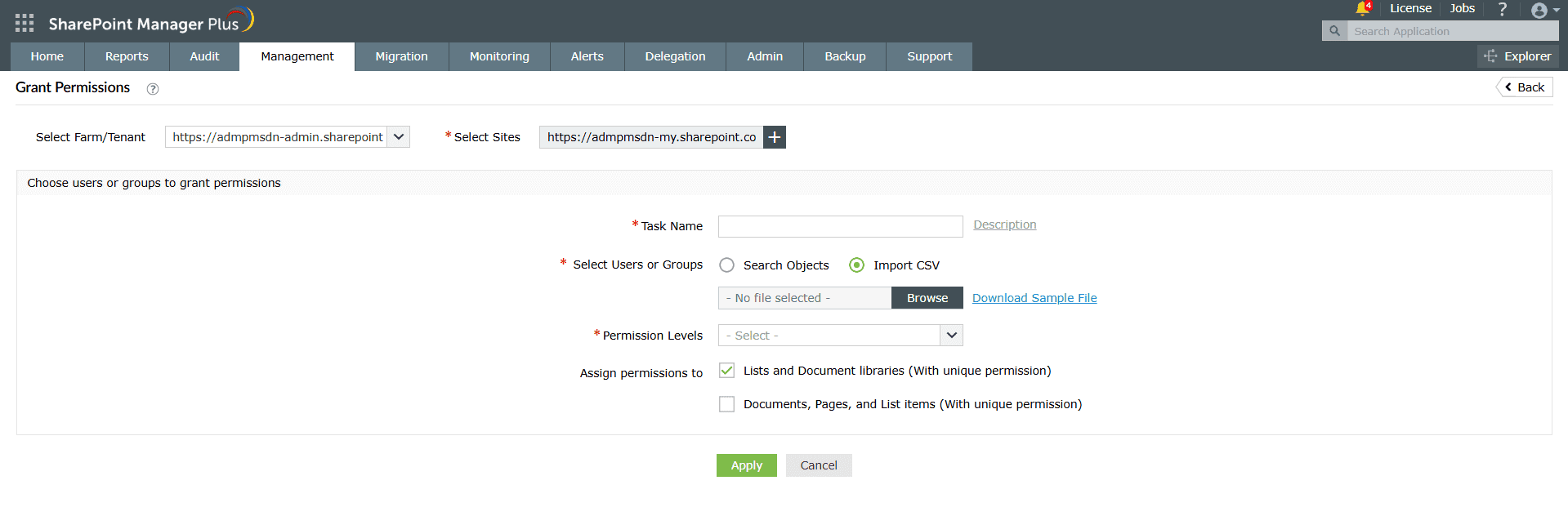 Manage SharePoint site access by assigning permissions to users and groups. Add objects individually or import a CSV file for bulk assignment. Control access to lists and documents that have unique permissions.