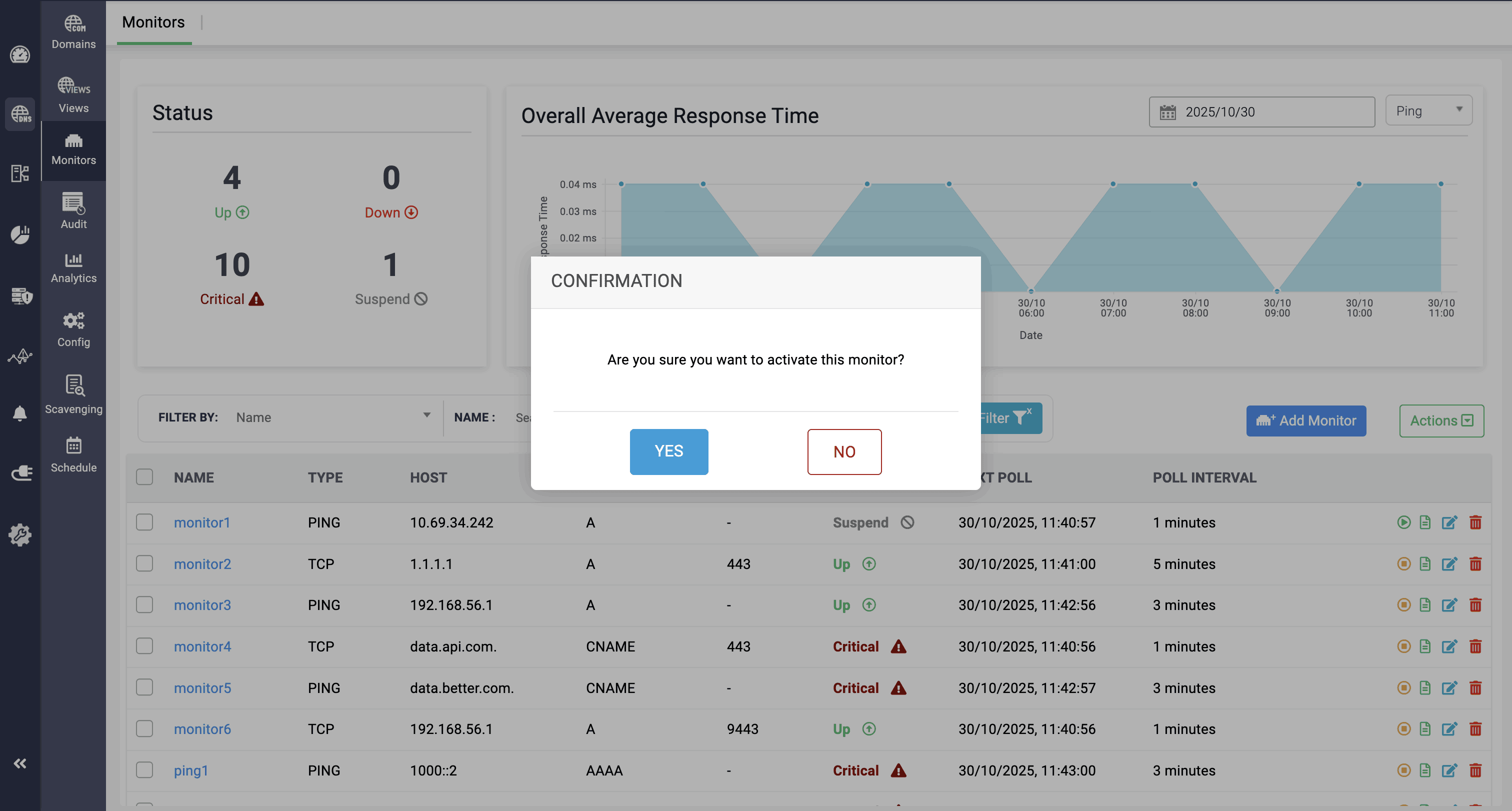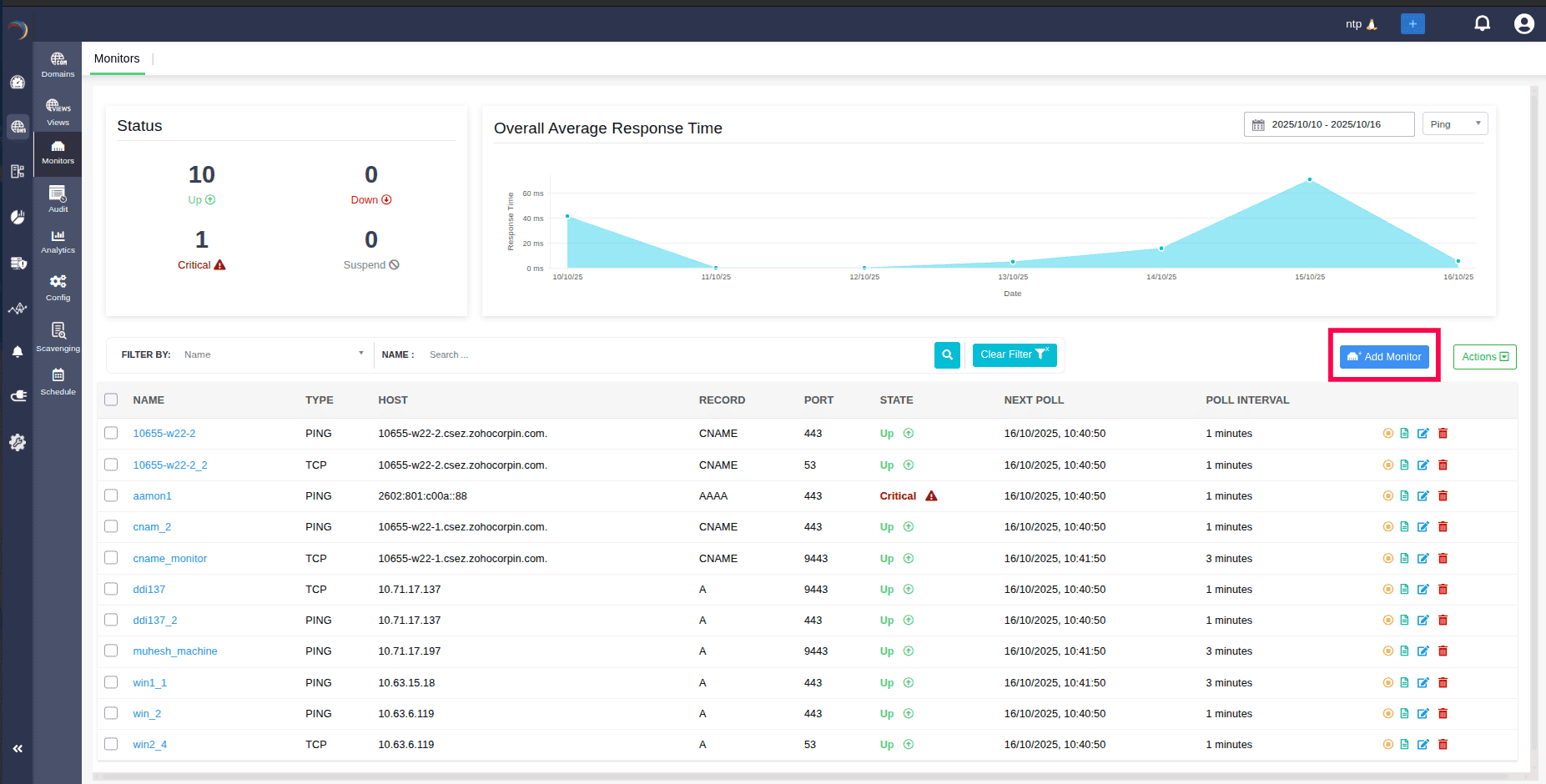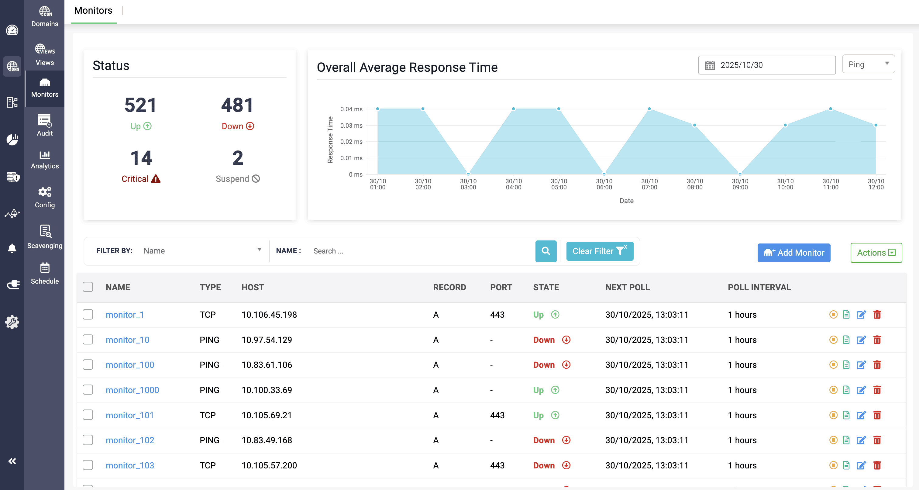 แดชบอร์ดการมอนิเตอร์ ของ DDI Central ช่วยให้มองเห็นสถานะปัจจุบันของ DNS record ได้อย่างชัดเจน (Up, Down, Critical, Suspended) รวมถึงค่าเวลาในการตอบสนองเฉลี่ย และมุมมองแบบตารางของรายละเอียดการมอนิเตอร์ เช่น ชื่อ ประเภท โฮสต์ Record ที่เชื่อมโยง Port, Next Poll และ Poll Interval