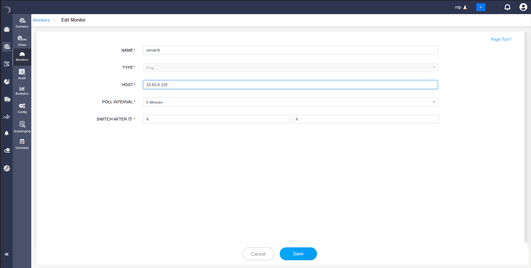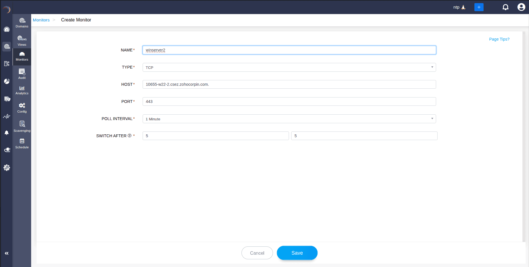 สามารถสร้างมอนิเตอร์ใหม่ได้โดยคลิกที่ไอคอน Add Monitor ซึ่งระบบจะนำไปยังหน้า Create Monitor หน้านี้มีช่องสำหรับกรอกรายละเอียด เช่น ชื่อ ประเภท (PING หรือ TCP) โฮสต์ Poll Interval และค่า SWITCH AFTER ซึ่งใช้กำหนดจำนวนรอบของ Poll Intervals ก่อนที่จะสลับ Record โดยอัตโนมัติ