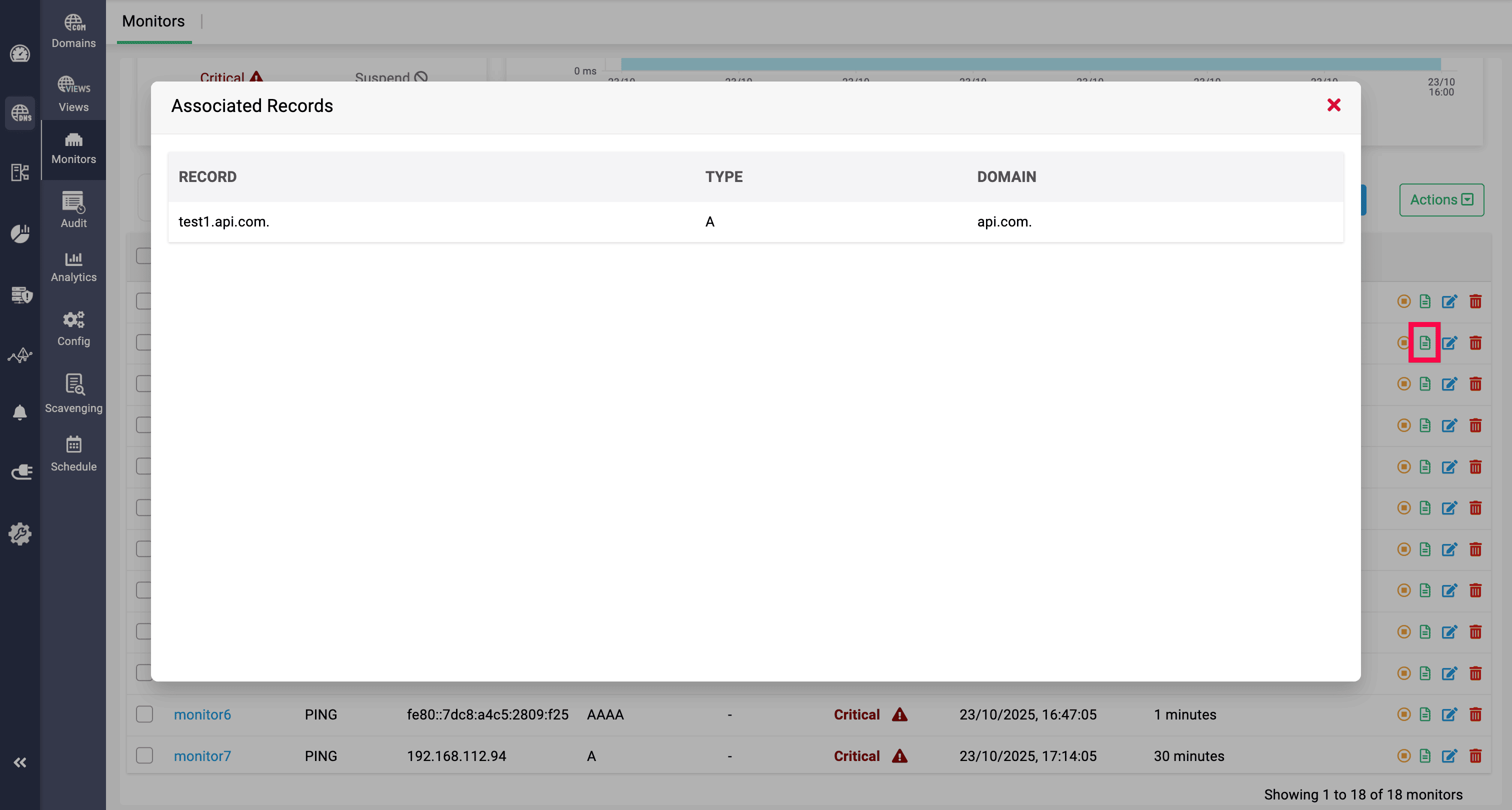 เมื่อคลิกที่ไอคอน Associated DNS Records สีเขียวบนมอนิเตอร์ที่ต้องการ ระบบจะแสดงรายการ Record ที่เชื่อมโยงกับมอนิเตอร์นั้น พร้อมทั้งประเภท Record และโดเมนที่เกี่ยวข้อง
