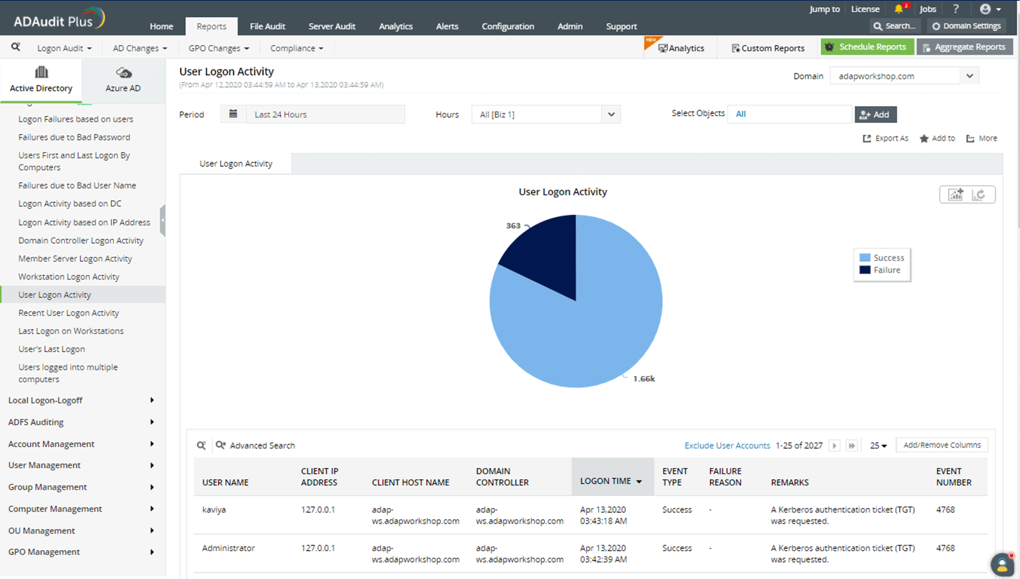 ManageEngine ADAudit Plus, kullanıcı oturum açma etkinliğini Kerberos kimlik doğrulama olaylarını kullanarak izlemenize yardımcı olabilecek bir Active Directory denetim aracıdır. Ayrıca, anormal oturum açma etkinliğiyle ilgili raporlarla olası güvenlik tehditlerini tespit edebilir ve bu tür tehditlere ilgili yanıtların otomatik olarak verilmesini sağlayabilirsiniz.