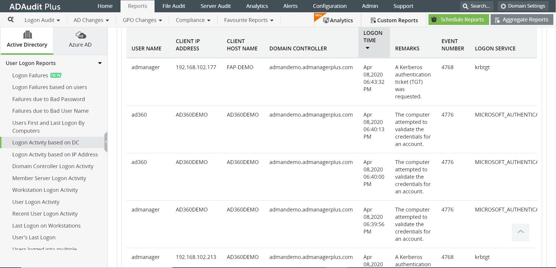 ADAudit Plus, basit ve sezgisel olarak tasarlanmış bir kullanıcı arayüzünde görüntülenen, oturum açan kullanıcıları almak için etki alanındaki tüm DC'leri otomatik olarak tarayarak raporu oluşturacaktır.