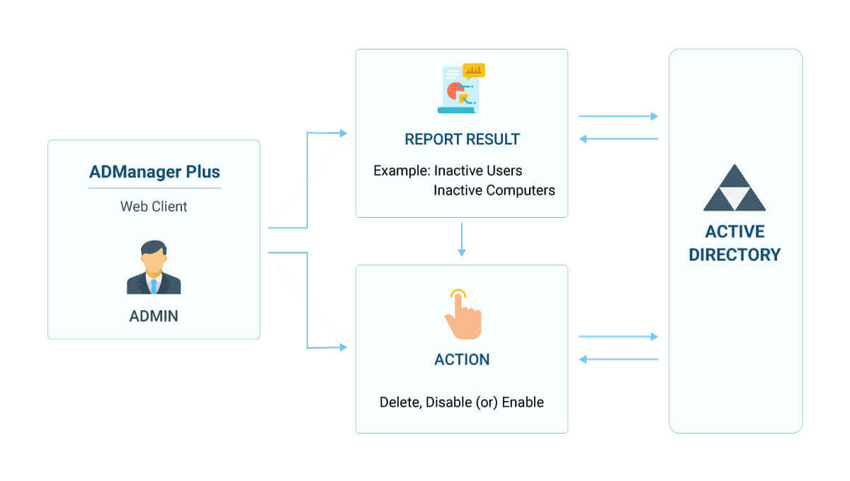 ADManager Plus, raporlar oluşturmanızı ve bunları doğrudan bu raporlardan silme, devre dışı bırakma veya farklı bir OU'ya taşıma gibi yönetim eylemlerini gerçekleştirmenizi sağlayarak etkin olmayan AD hesaplarını tespit etmenize ve kaldırmanıza yardımcı olur.