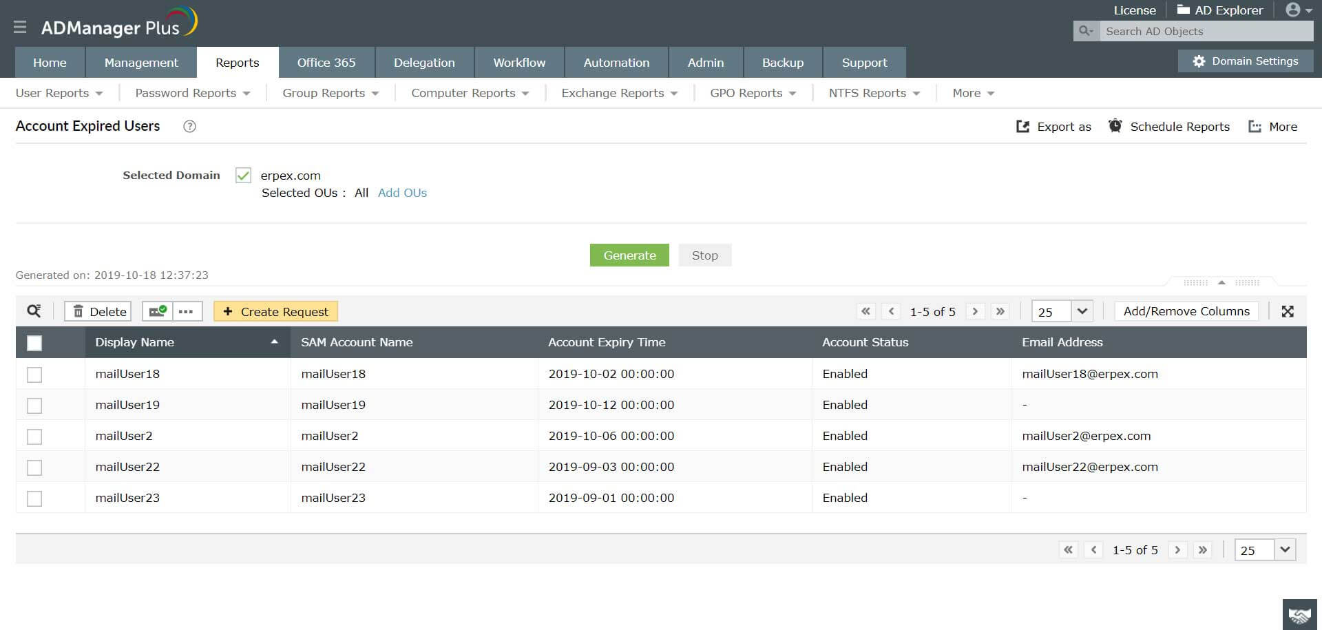 Uzun zamandır kullanımdan kaldırılmış olan Active Directory kullanıcı hesaplarının süresi, kullanıcı ya da yönetici bunları bilmeden dolmuş olabilir. Süresi dolan hesapları bulmak için bir komut dosyası yazmak zahmetli olabilir, ADManager Plus rapor oluşturucusu Active Directory'i tarar ve size tüm süresi dolmuş hesapların bir listesini verir. Yöneticiler, kullanıcıları silerek, devre dışı bırakarak veya süresi dolmuş kullanıcıları başka bir kuruluş birimine taşıyarak doğrudan rapor içinden proaktif bir biçimde ağlarının güvenliğini sağlayabilir. Aynı zamanda hesap süresi dolmuş olan kullanıcılar ve hesabı kilitlenen kullanıcılar gibi diğer önemli raporları yazdırabilir, XLS, CSV, PDF, HTML biçimlerinde dışa aktarabilir ve daha fazlasını yapabilirsiniz.