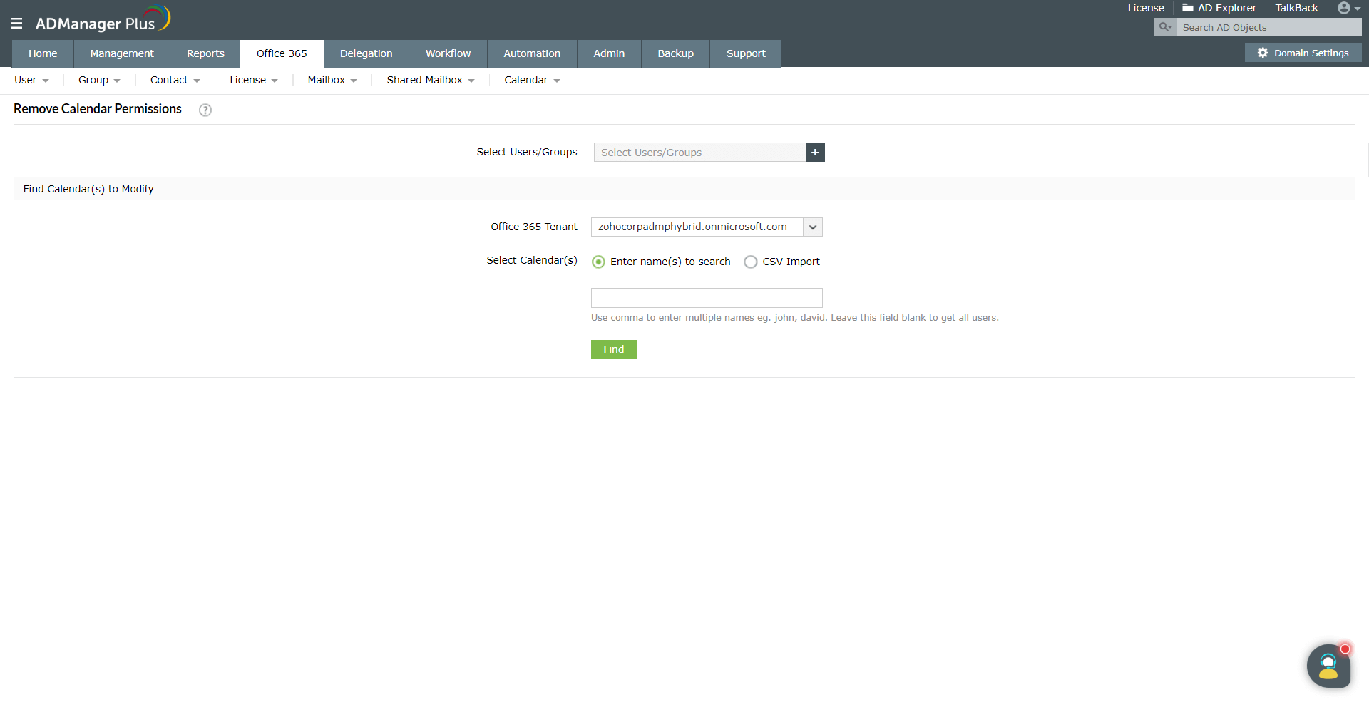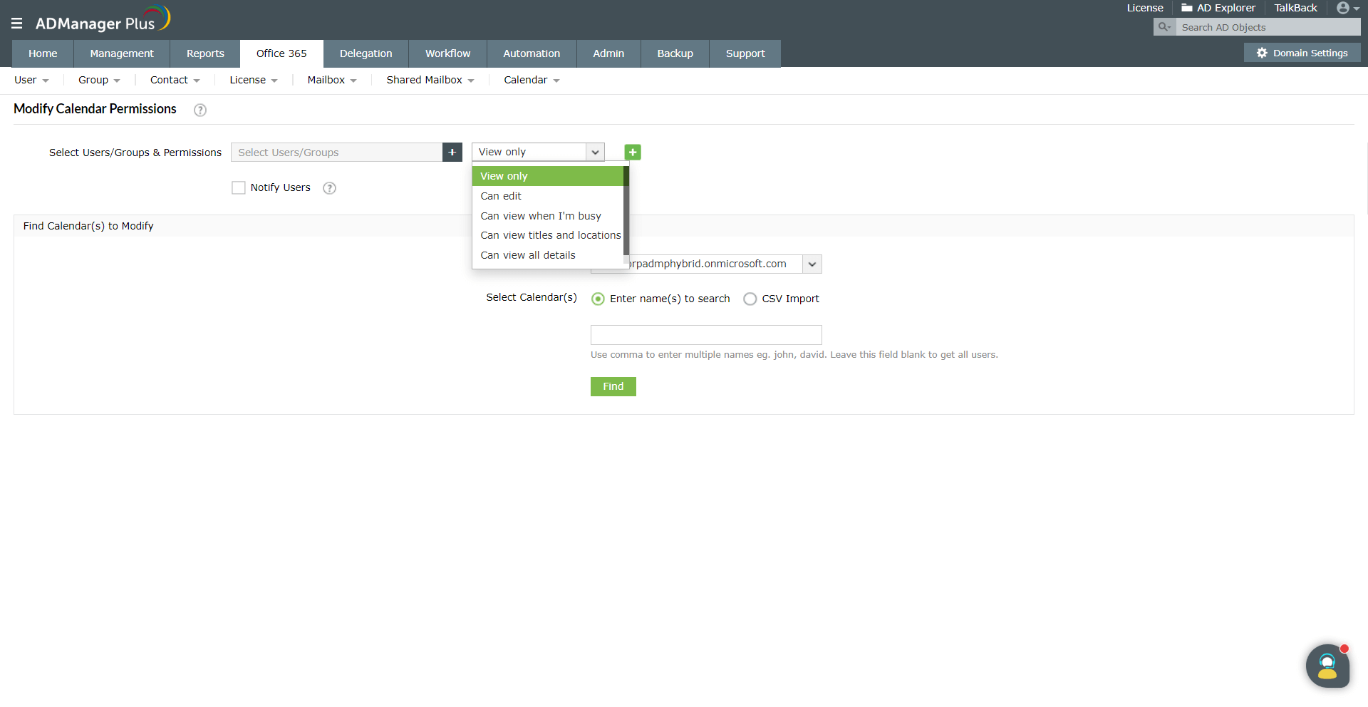ADManager Plus'ın Office 365 Takvim Yönetimi özelliği bu zorluğu ele alarak yöneticilerin Office 365 kullanıcılarının takvim klasörü izinlerini toplu olarak değiştirmesi veya kaldırmasını kolaylaştırır.