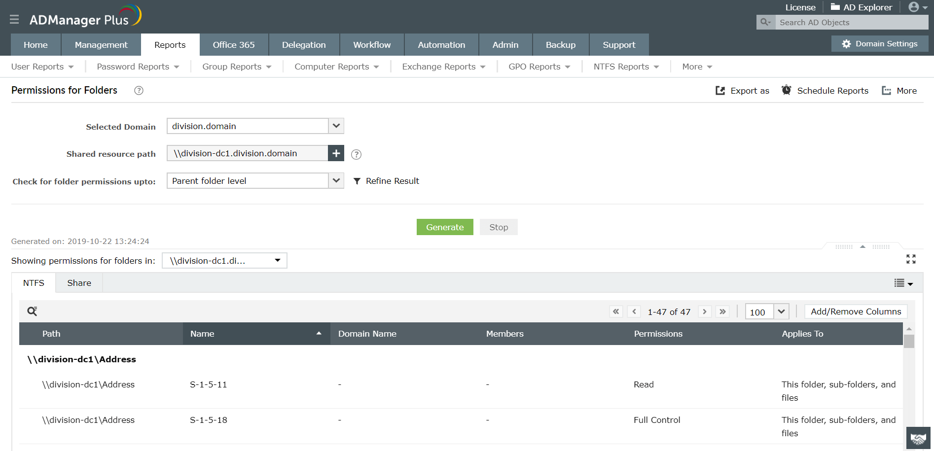 - Etki alanını seçin. Tercih edilen hesapları seçin ve onay kutularını seçerek veya bilgisayarı aramak için Hızlı bul özelliğini kullanarak Klasörleri Kontrol Et alanında bilgisayarı seçin. Generate seçeneğine tıklayın.