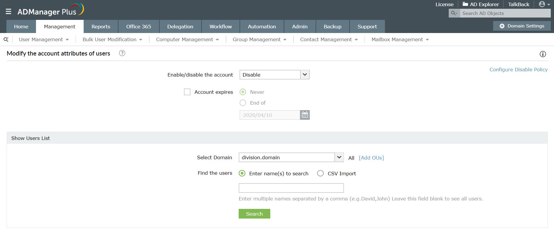 - AD hesapları için devre dışı bırakma ilkelerini yapılandırmak mümkün değildir. Örneğin, ADManager Plus, devre dışı bırakılmış hesapları otomatik olarak ayrı bir OU'ya taşıma ya a kaldırma, ilişkili lisanslar ile posta kutularını devre dışı bırakma, ana klasörleri silme ve daha fazlası gibi bir AD hesabını devre dışı bıraktığınızda olacaklar ile ilgili koşulları ayarlamanıza olanak tanır.