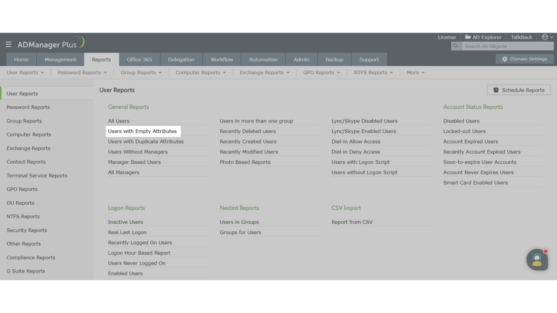 - User Reports bölümünden General Reports sütunundan Users with Empty Attributes raporunu seçin.