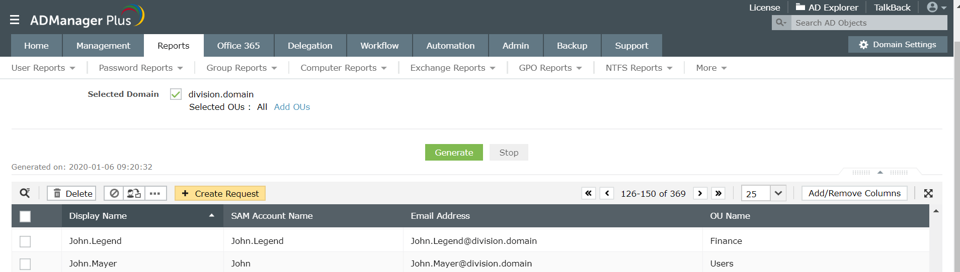 - Domain ve OU’ları seçin. Raporu Generate ile üretin.