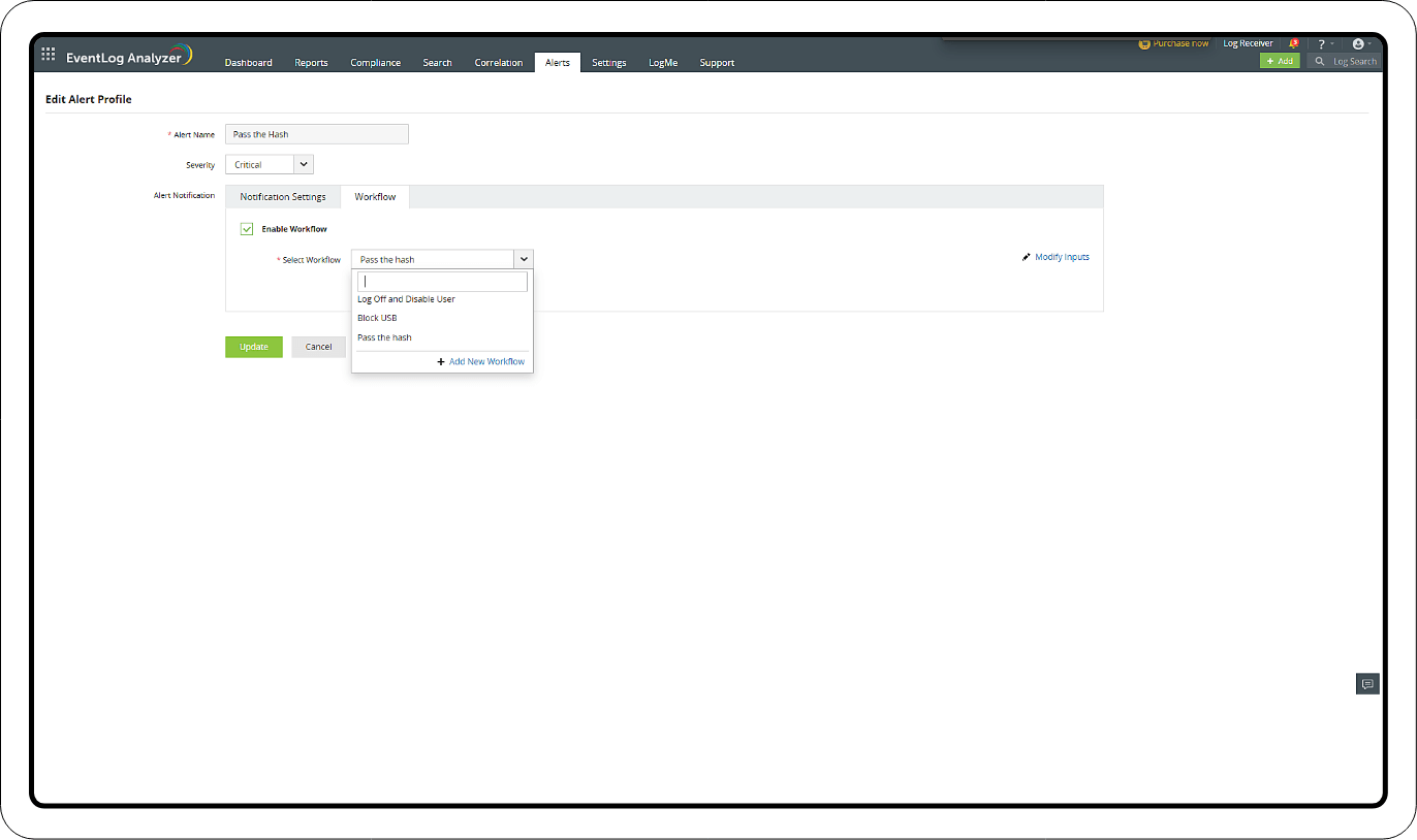 - Log360 konsolu > SIEM > Uyarılar alanına gidin > sağ üst köşedeki ayarlar simgesine tıklayın > Profilleri Yönet > Korelasyon Uyarı Profilleri > alanına gidin, ara simgesine tıklayın ve oluşturulan Pass the Hash kuralını seçin > Yapılandır seçeneğine tıklayın.
