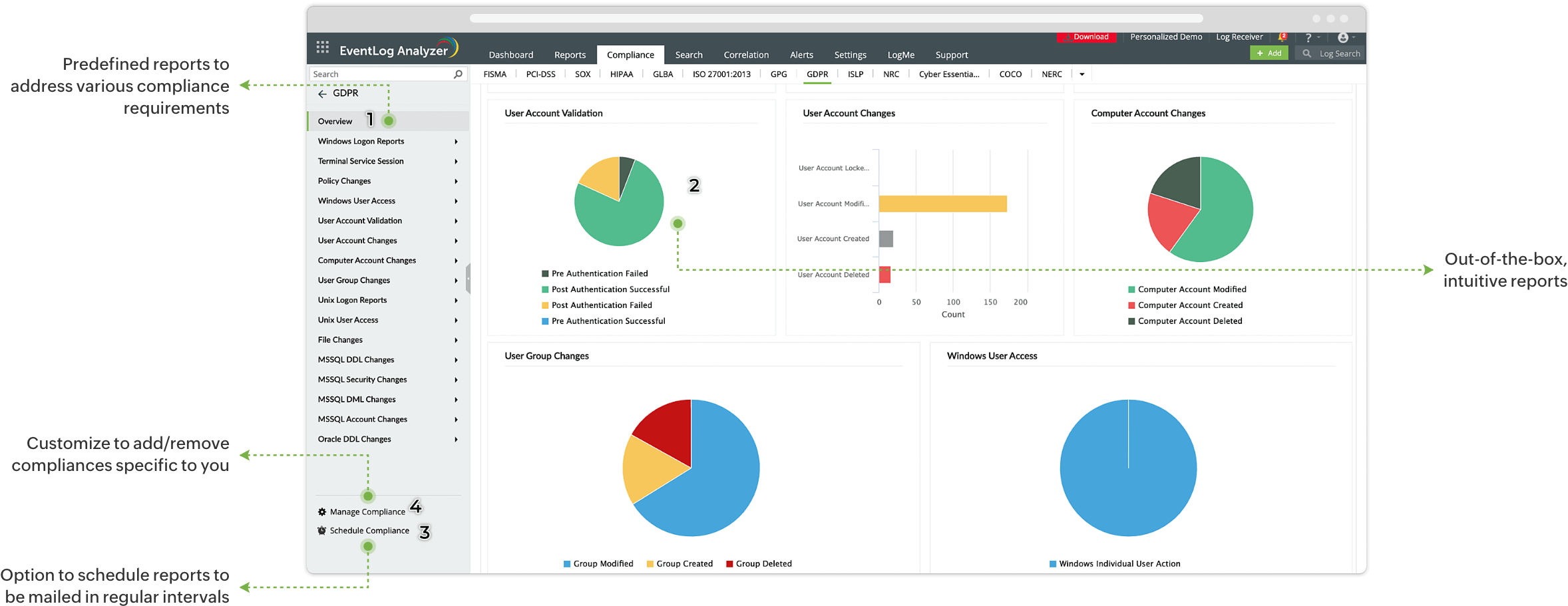 Birleşik Krallık'ta farklı işletmeler ve bunların tüketicilerine özgü bazı veri koruma yasaları yürürlüktedir. Birçok düzenleyici çerçevenin gerekliliklerini kolaylıkla karşılamanıza yardımcı olabilecek uçtan uca bir günlük yönetimi çözümü olan EventLog Analyzer ile kuruluşunuzun düzenleyici yükümlülüklerini karşılamak için BT ve güvenlik denetimini manuel olarak gerçekleştirmek zorunda kalmayacaksınız. Çözüm, ağ etkinliği günlüklerini izler, uyumluluk için hazır raporlar oluşturur ve uyumluluk ihlalleri ile şüpheli veri ihlali faaliyetlerinde düzeltme faaliyetlerinin gerçekleştirilmesi için anında uyarılar verir.