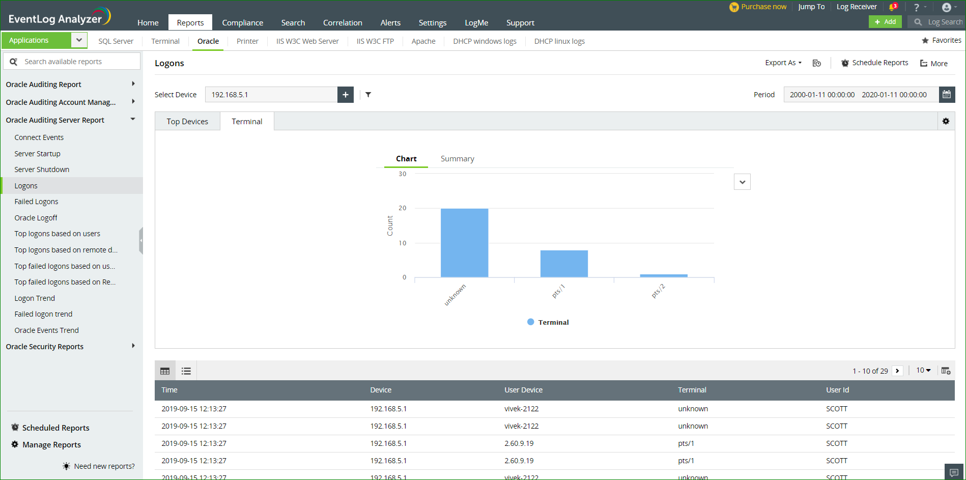 EventLog Analyzer meydana gelen olayların tam olarak görüntülenebilmesine yardımcı olan Oracle veritabanına özgü önceden tanımlanmış güvenlik raporları verir.Bu raporlar aşağıdakilerle ilgili bilgiler verir