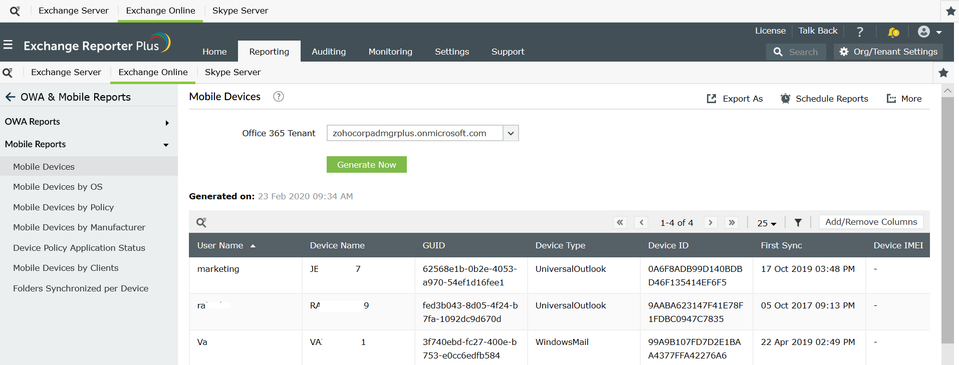 Bir Exchange raporlama, değişiklik denetleme ve izleme aracı olan Exchange Reporter Plus, ActiveSync cihazlarının durumu ve diğer ayrıntıları hakkında bilmeniz gereken tüm bilgileri sağlayan çok sayıda rapor sunar.