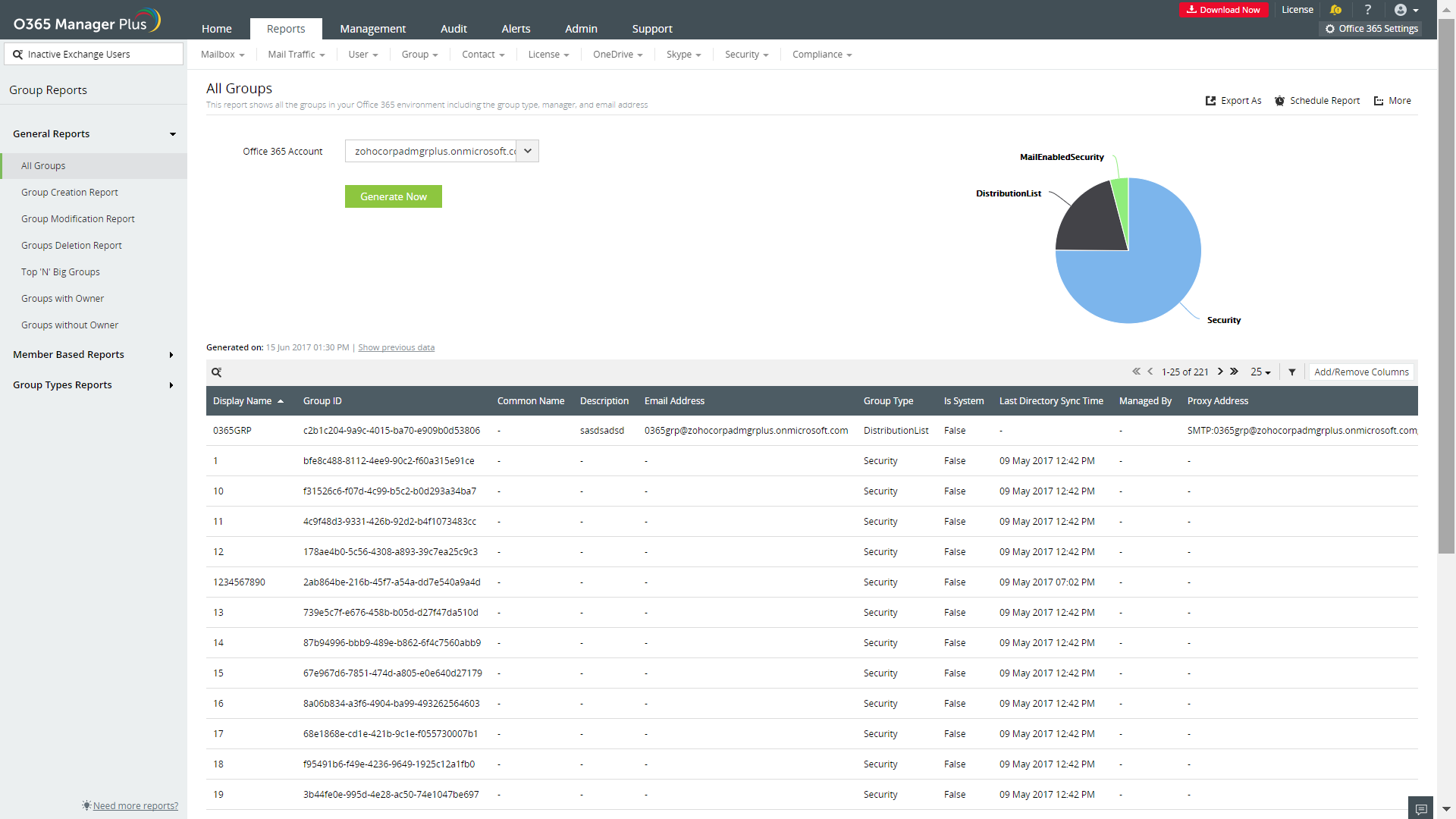 Güvenlik grupları: Bu rapor, Microsoft 365 ortamınızdaki her güvenlik grubuna dair detaylı bir görüntü sağlar. Bu rapordaki bilgiler, kritik kaynak ve bilgilerin yanlış ellere geçmesinin önüne geçmenizde size yardımcı olur.